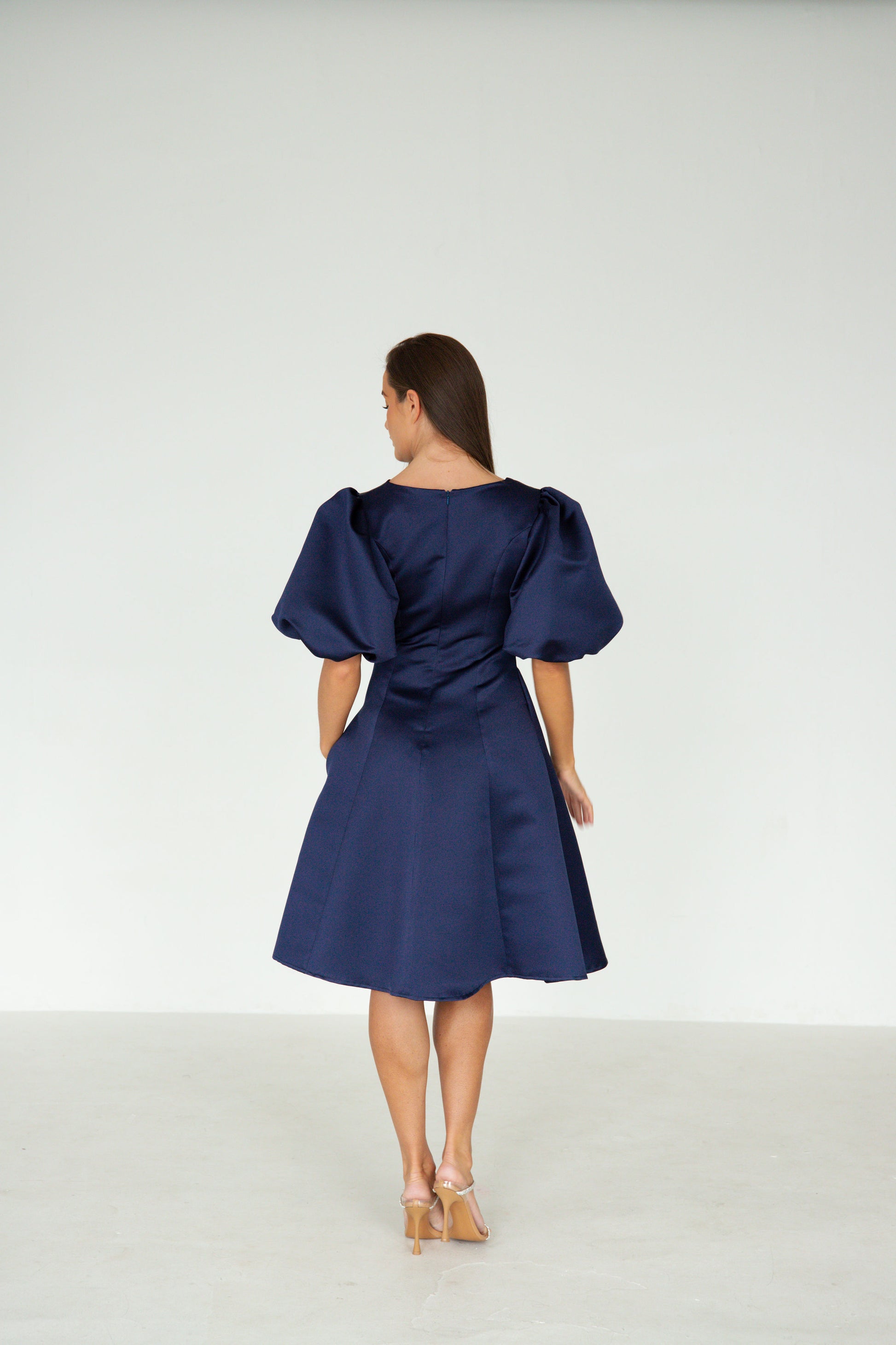 The Amalfi Dress in Navy dress is a statement piece for any special occasion. Featuring a classic navy duchess satin, dramatic puff sleeves and front and back princess seams that create a stunning silhouette. To top it all off, this dress also has pockets.