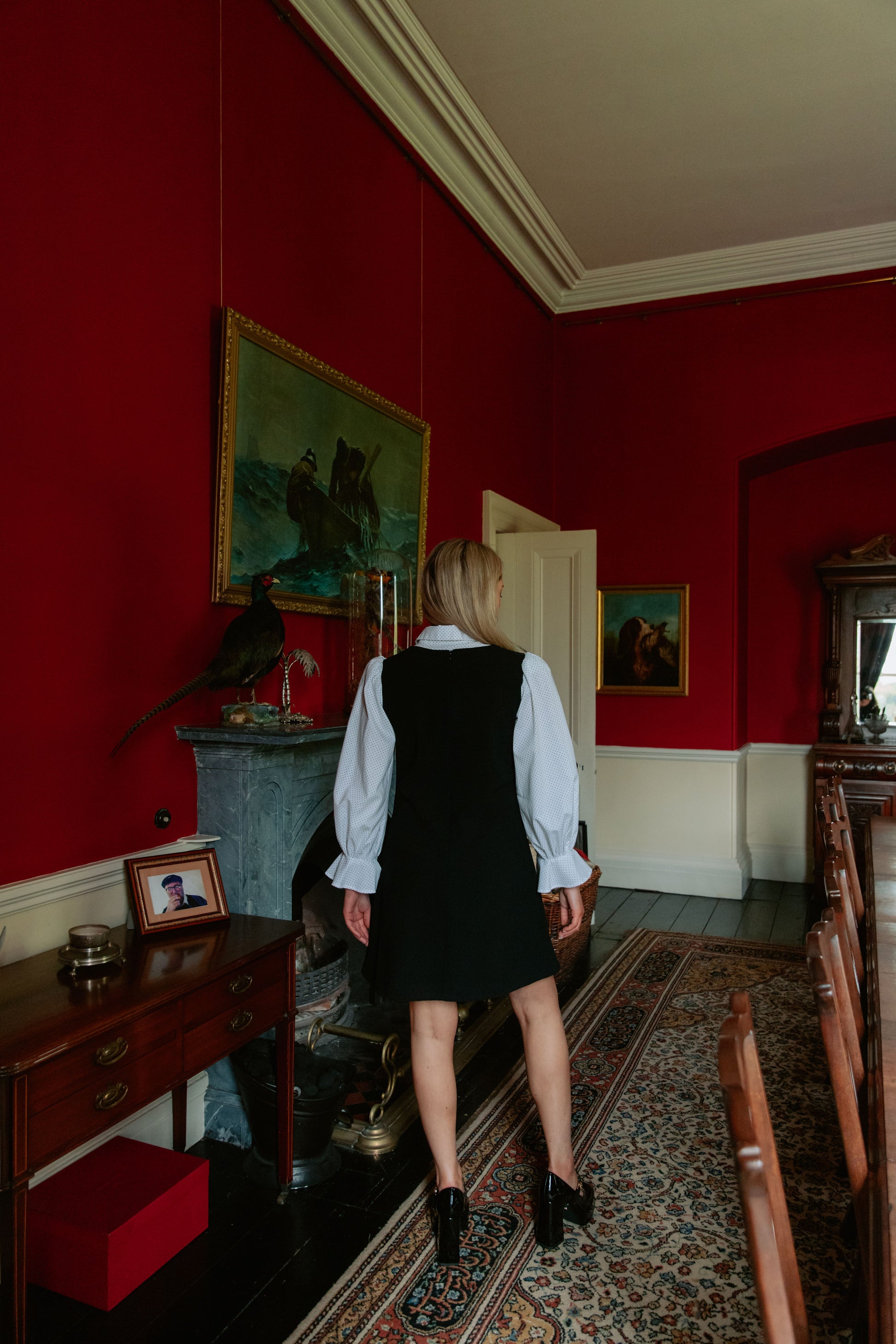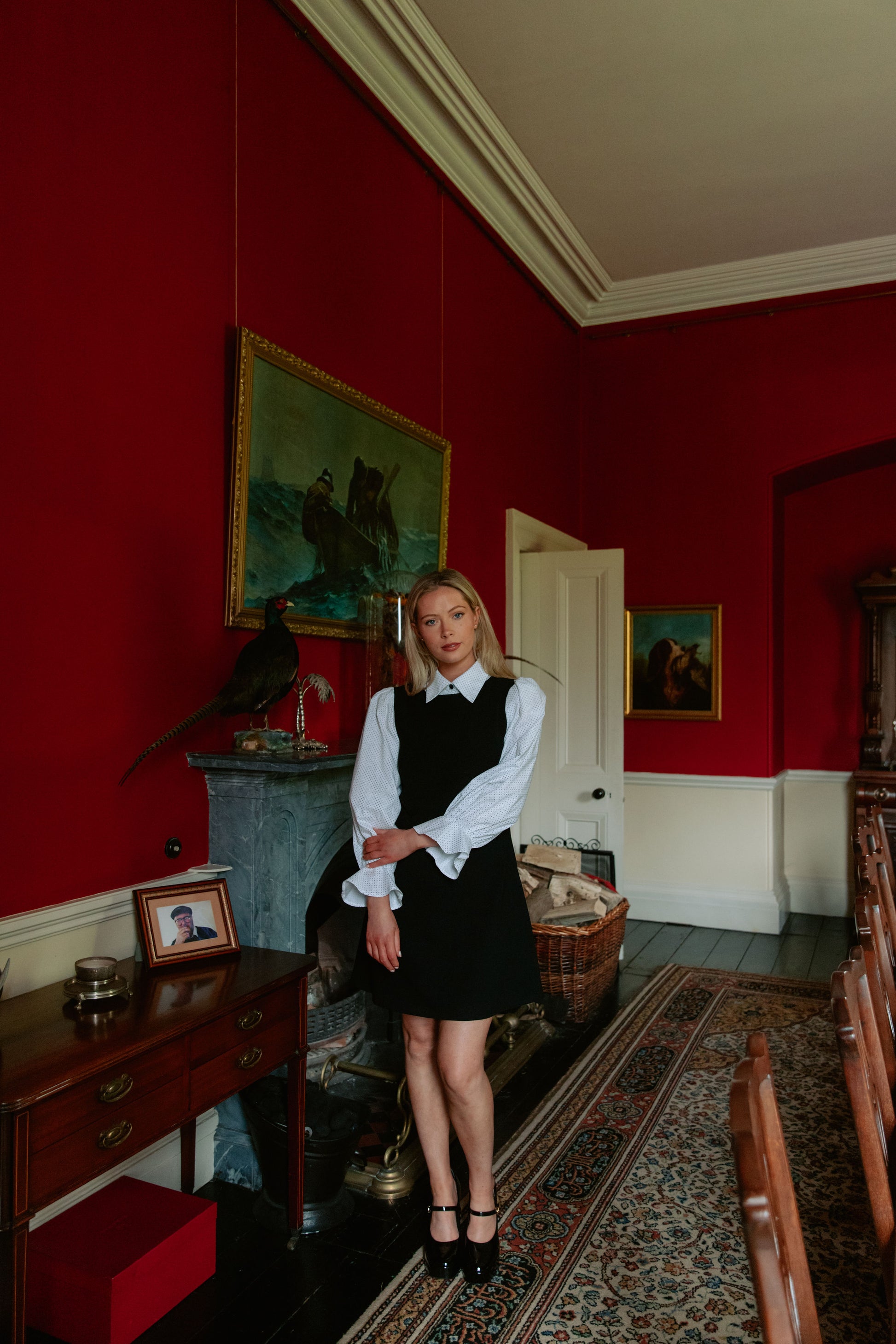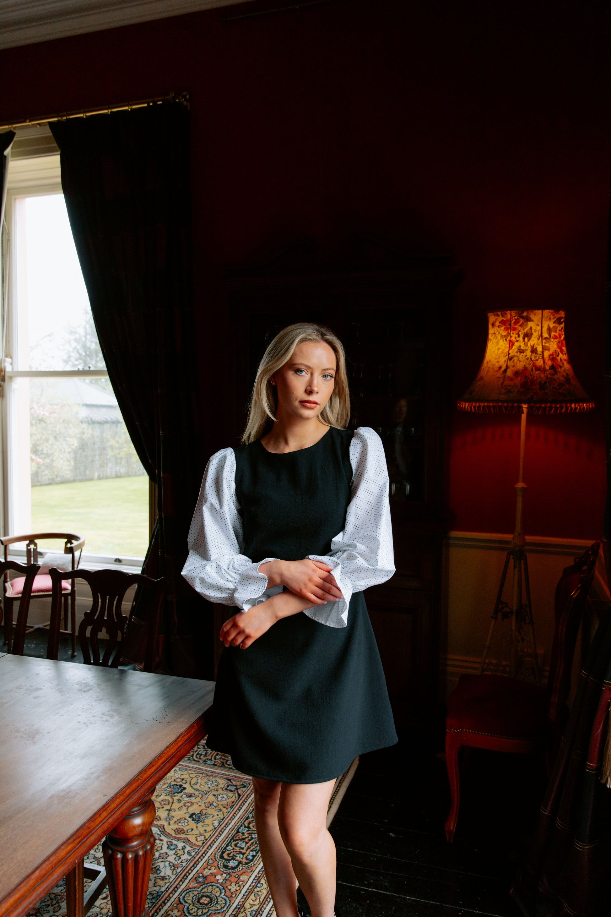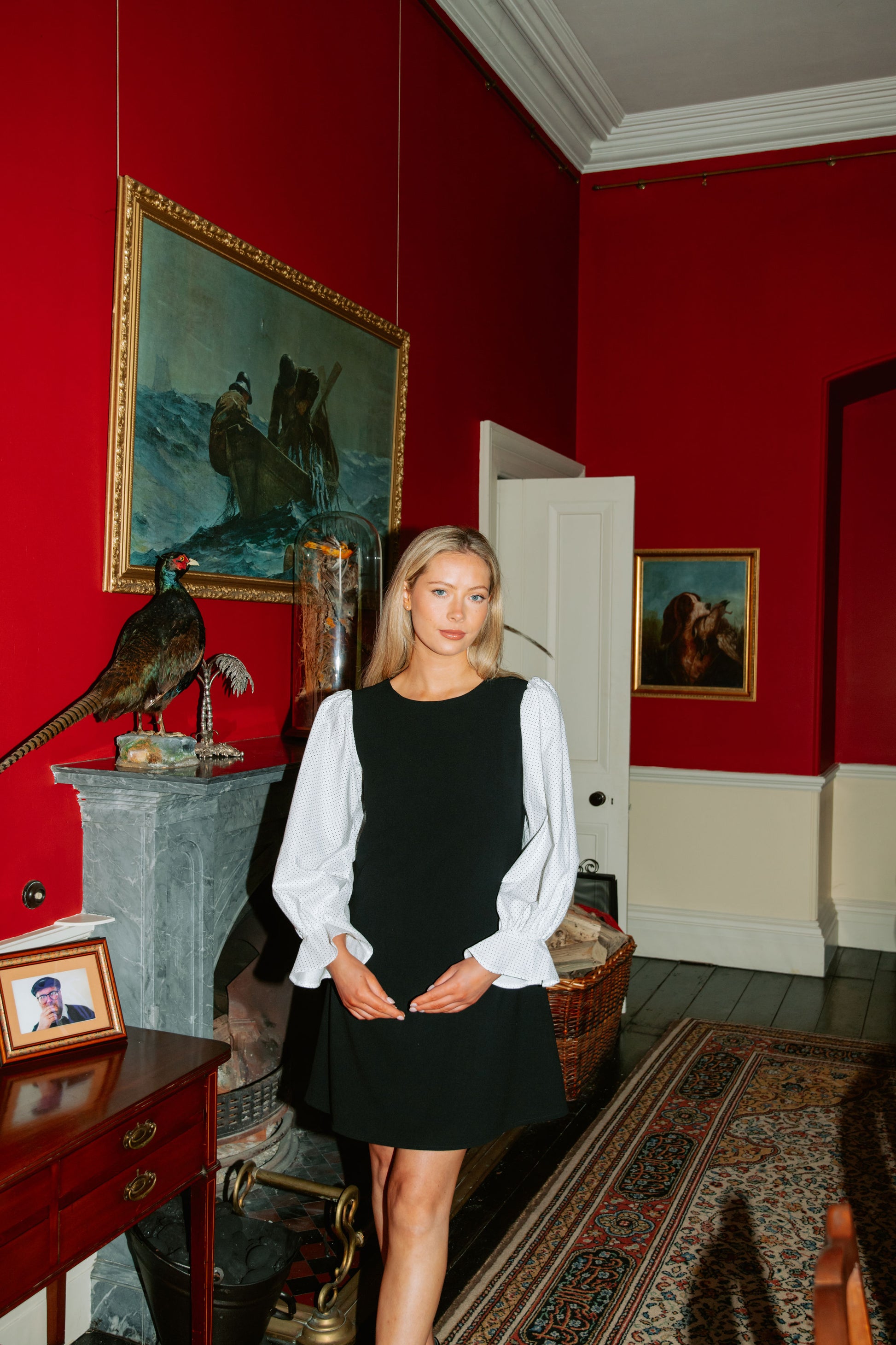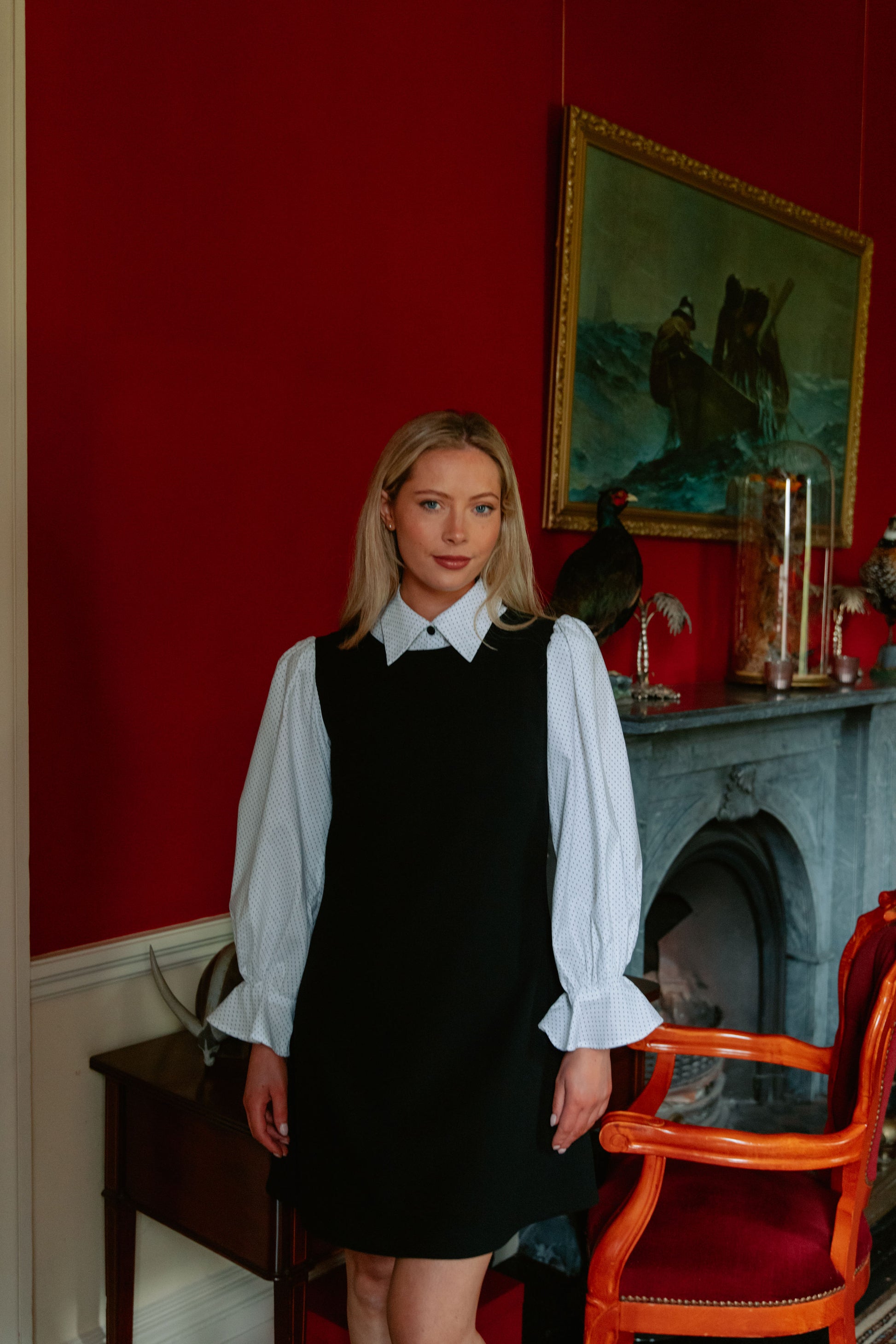 Elevate your everyday elegance with our Emily Dress, a timeless fusion of sophistication and modern style. Designed to give the illusion of layered separates, this chic piece features a wool shift style dress with contrasting white cotton sleeves with a pin dot print, a removable collar gives you the ability to change up the look.