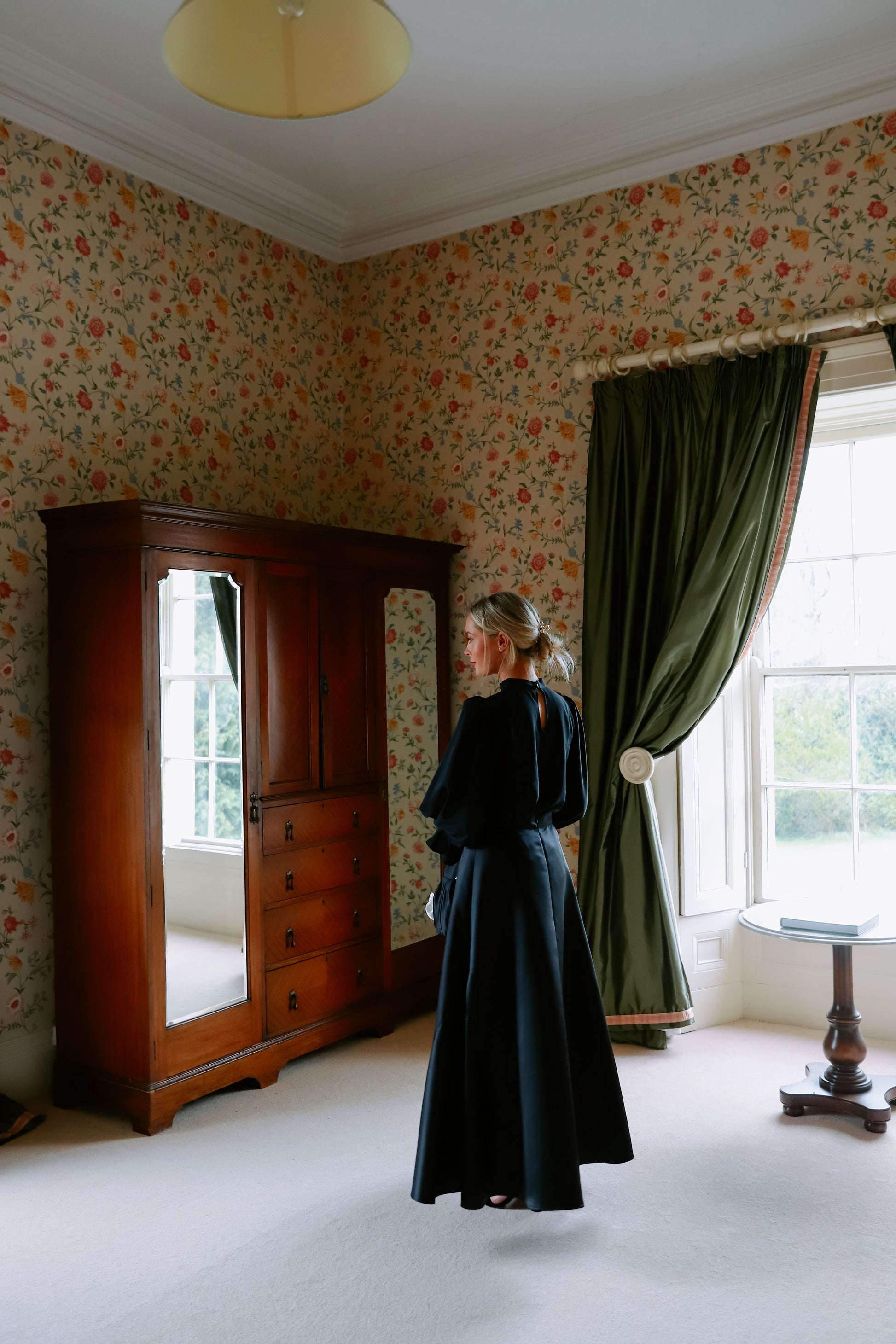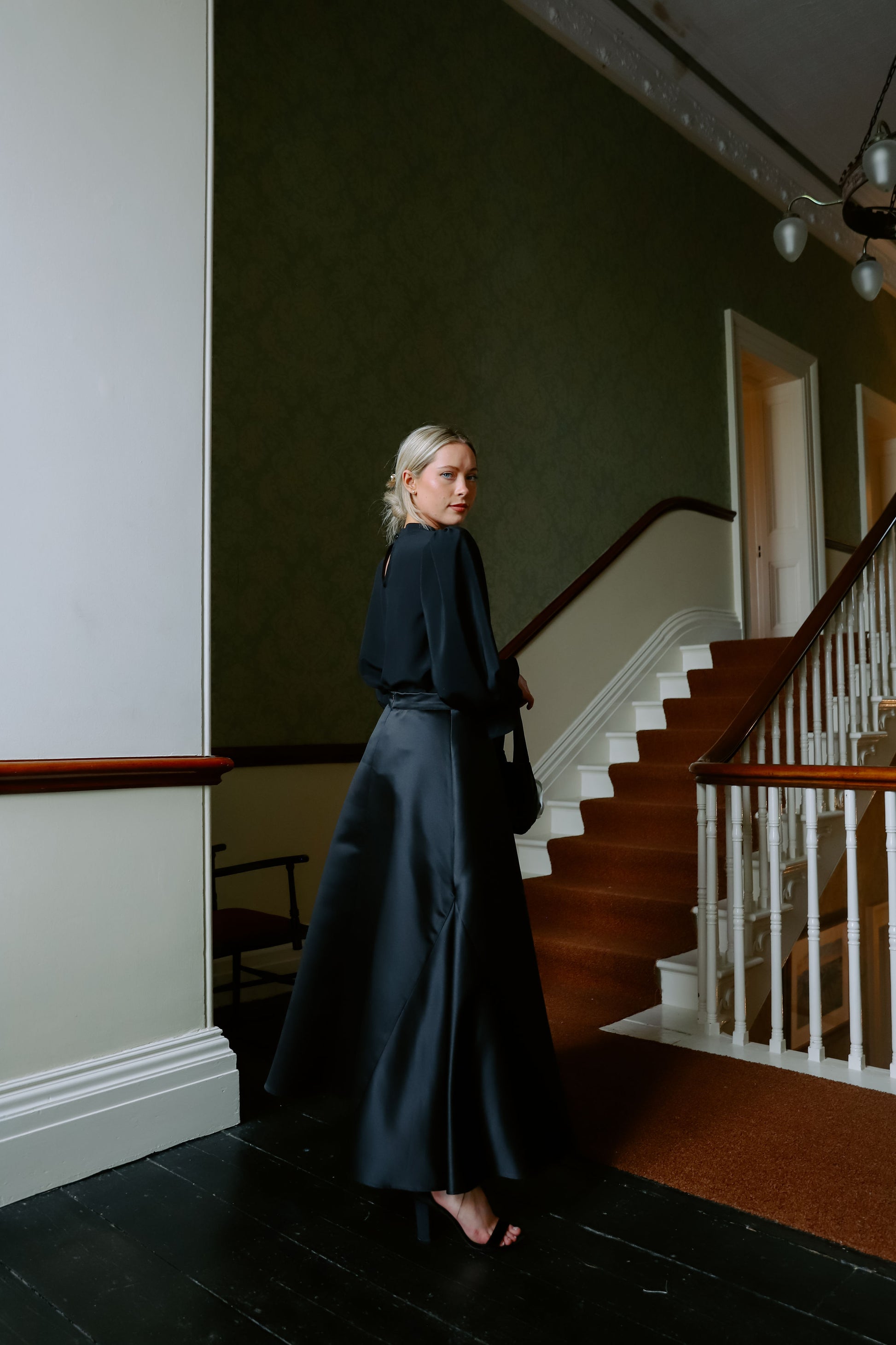Elevate your evening-wear with our elegant Kate Skirt in a timeless Black. Crafted from a luxurious duchess satin fabric, this skirt flows effortlessly from a cinched waist into a structured A-line silhouette that flatters every figure. The smooth sheen of the fabric adds a refined touch, making it the perfect piece for formal occasions, elegant dinners, or black-tie events.