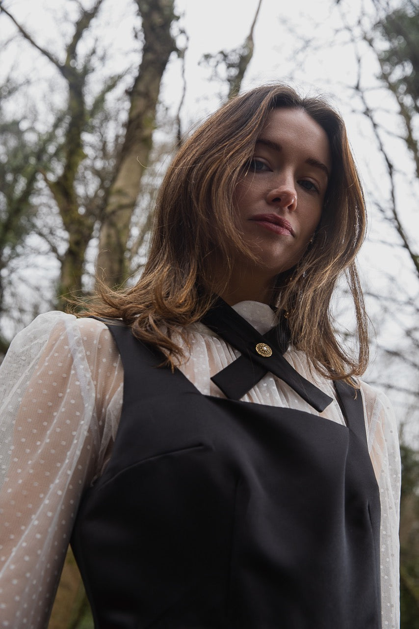 Black satin necktie with a gold button closure. Photographer with the Tulip Dress and Daisy Blouse