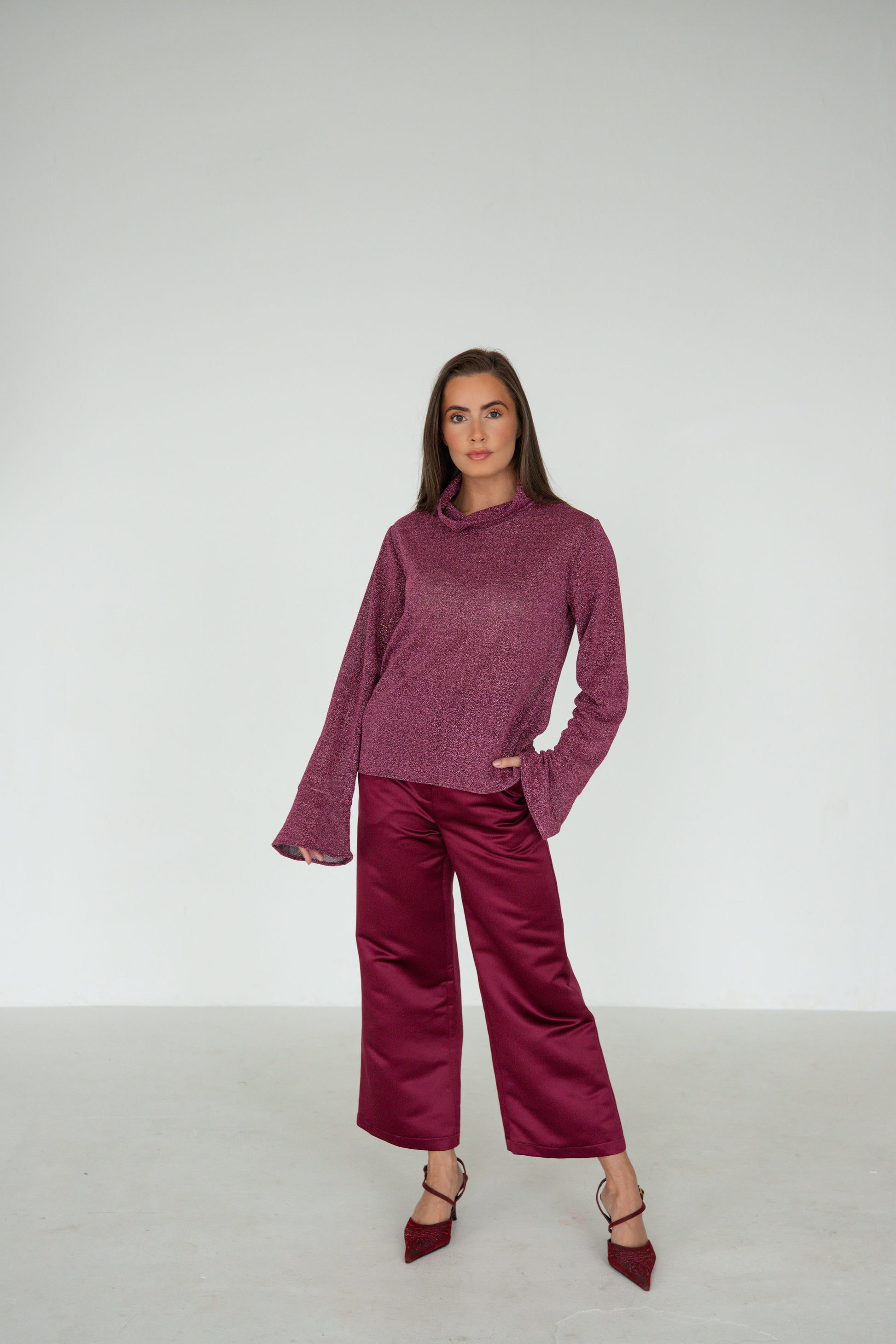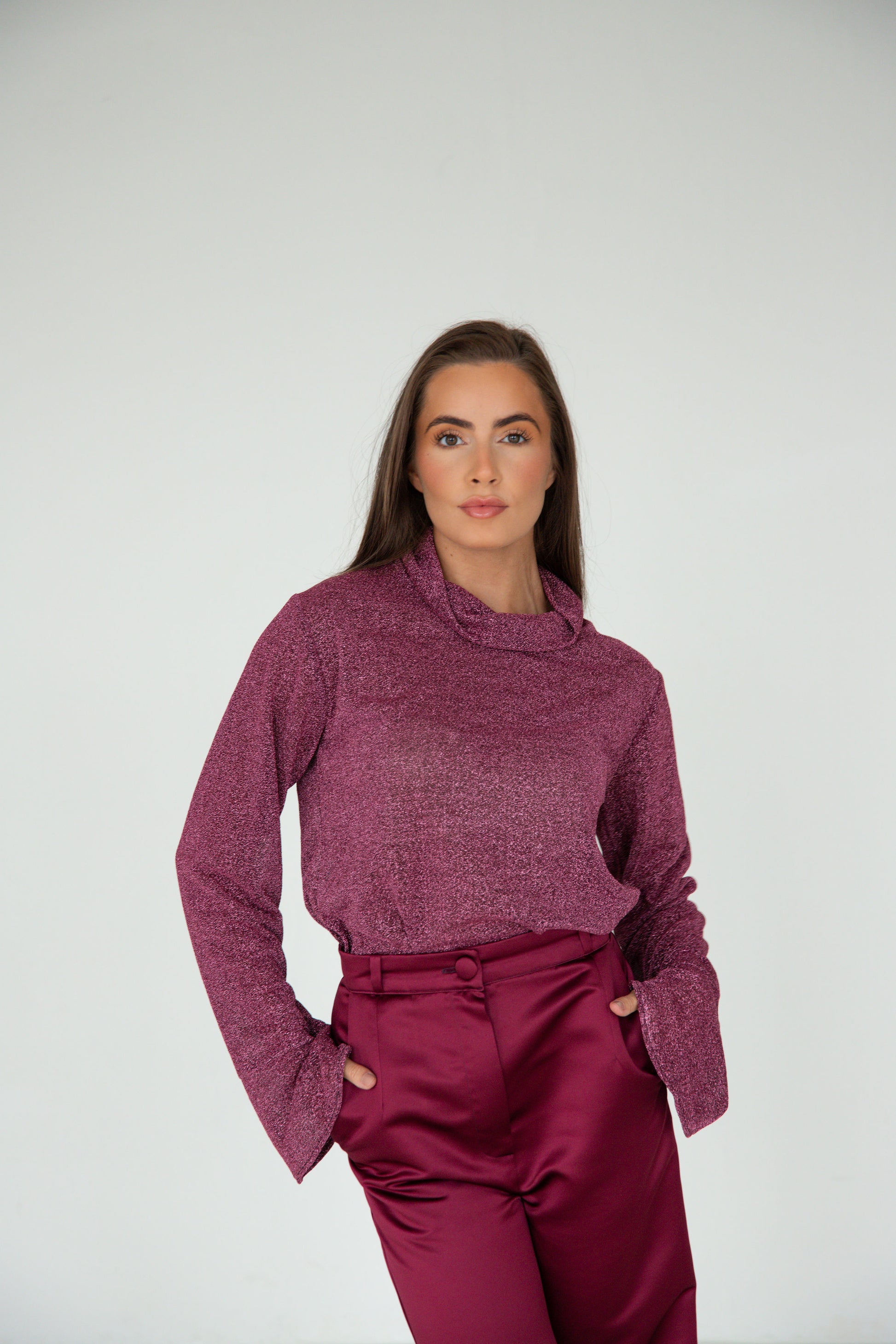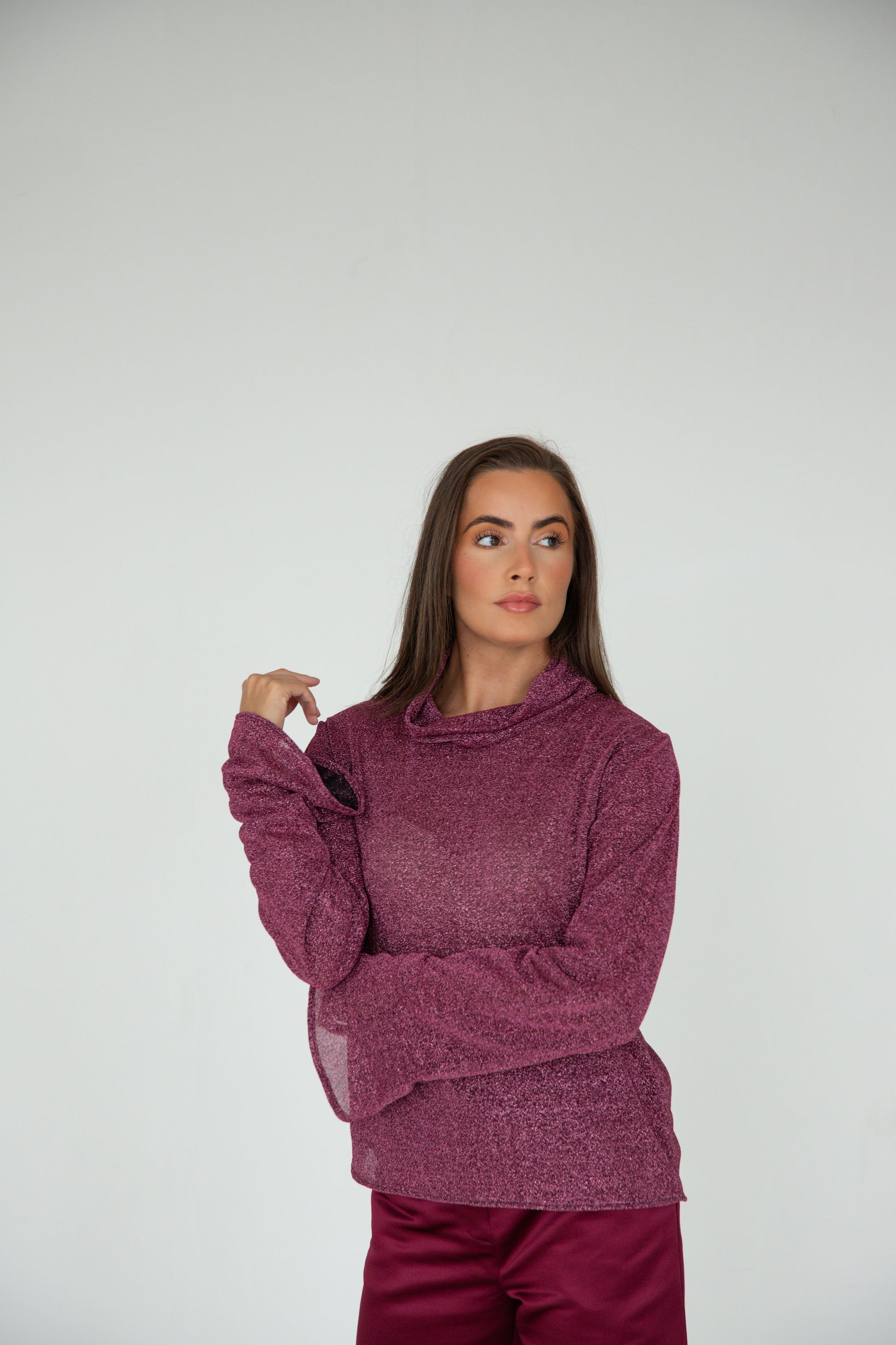 Featuring a long sleeve with a fluted cuff, a roll neckline and a glitter stretch fabric.