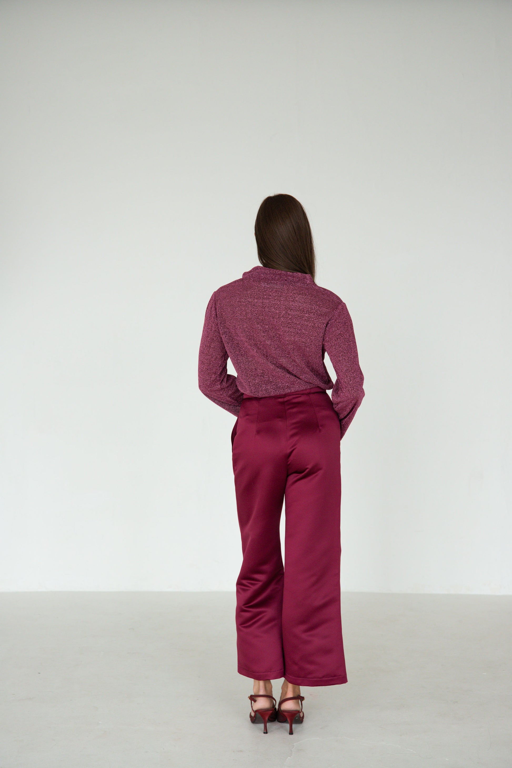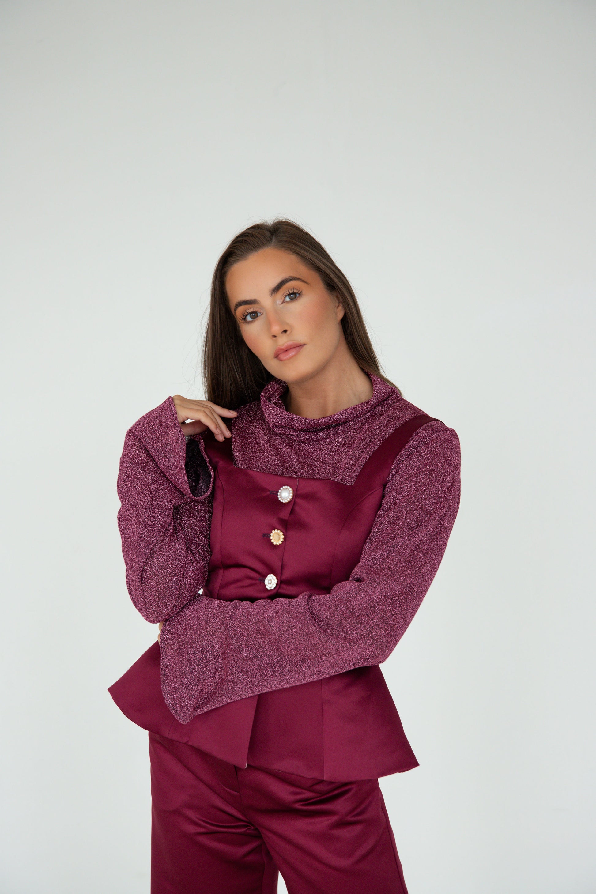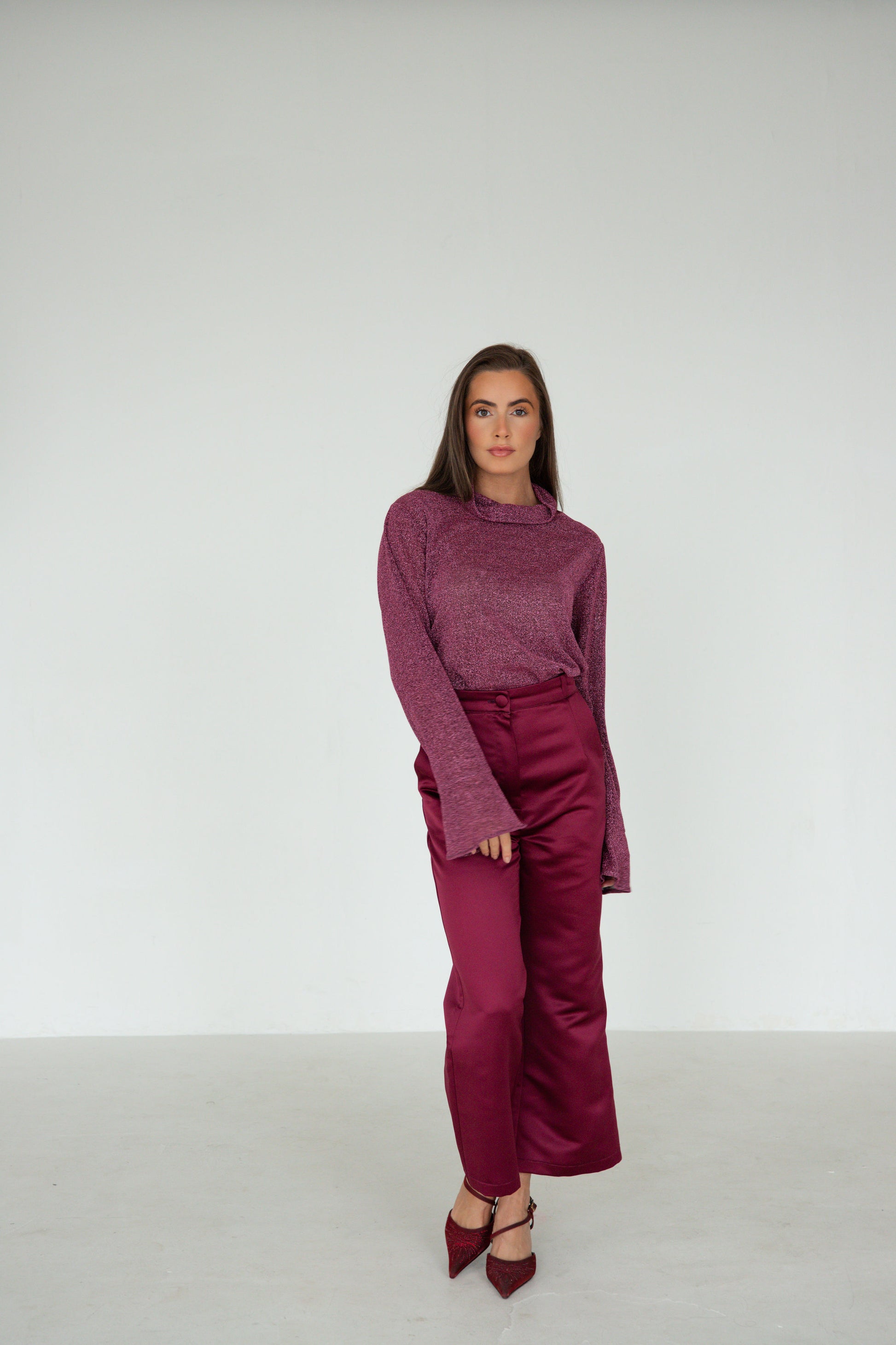 Featuring a long sleeve with a fluted cuff, a roll neckline and a glitter stretch fabric.