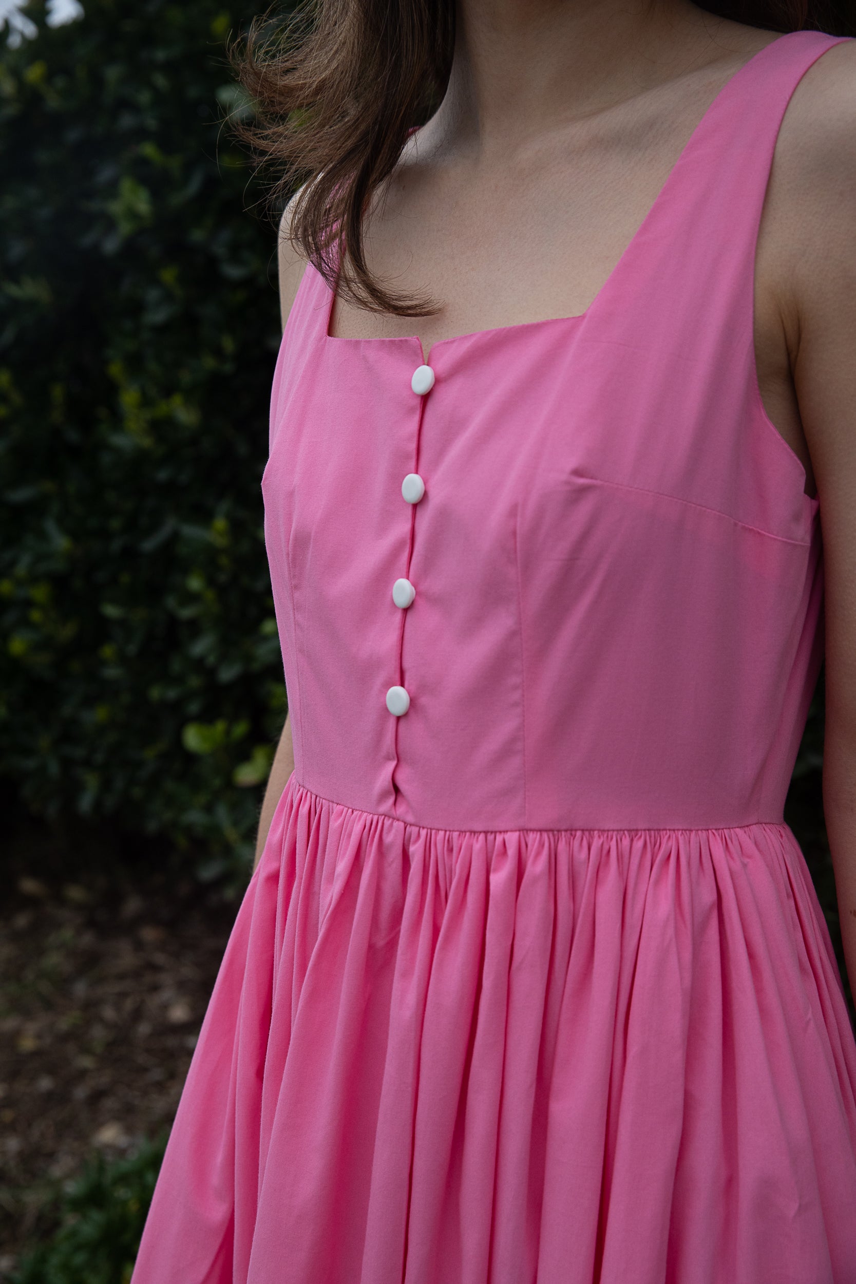 Stand out features include, button up front, square neckline, wide straps, and a gathered skirt with side pockets.