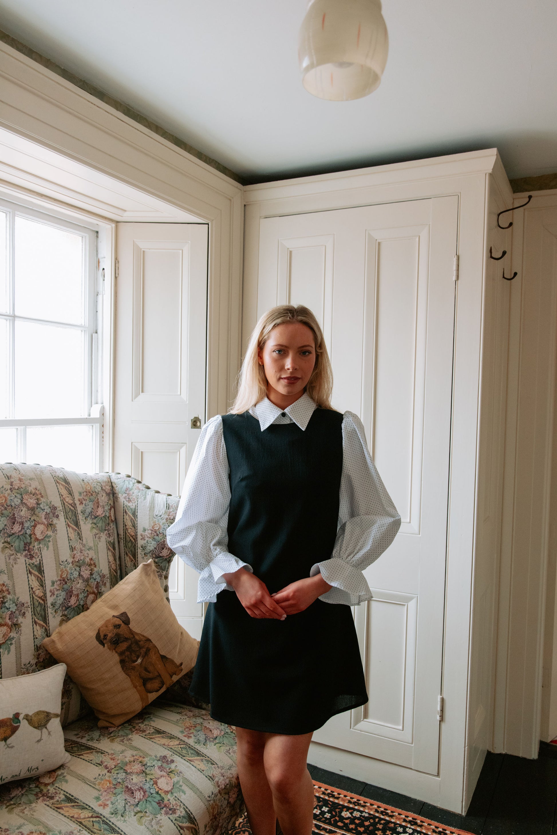 Elevate your everyday elegance with our Emily Dress, a timeless fusion of sophistication and modern style. Designed to give the illusion of layered separates, this chic piece features a wool shift style dress with contrasting white cotton sleeves with a pin dot print, a removable collar gives you the ability to change up the look.