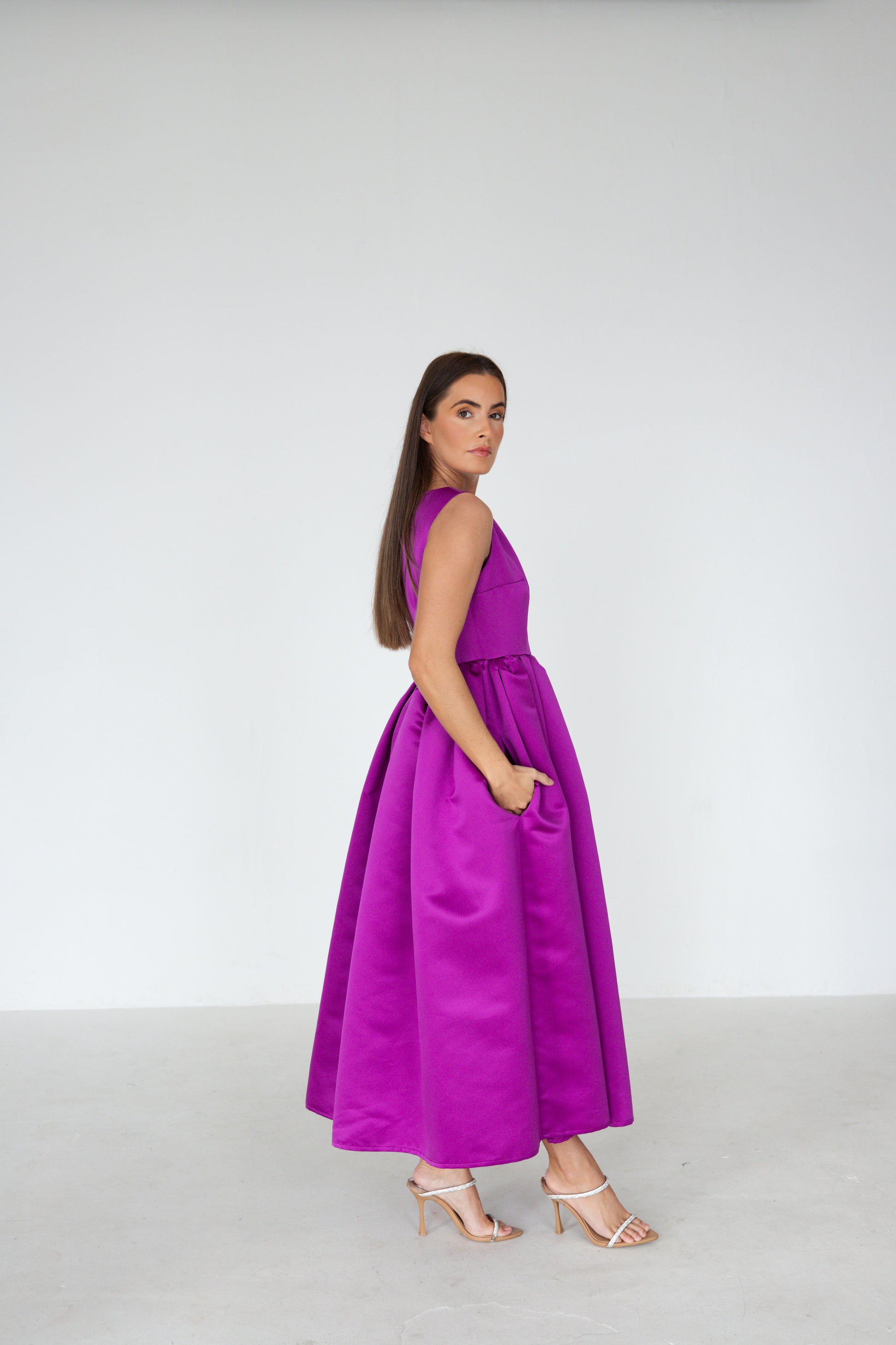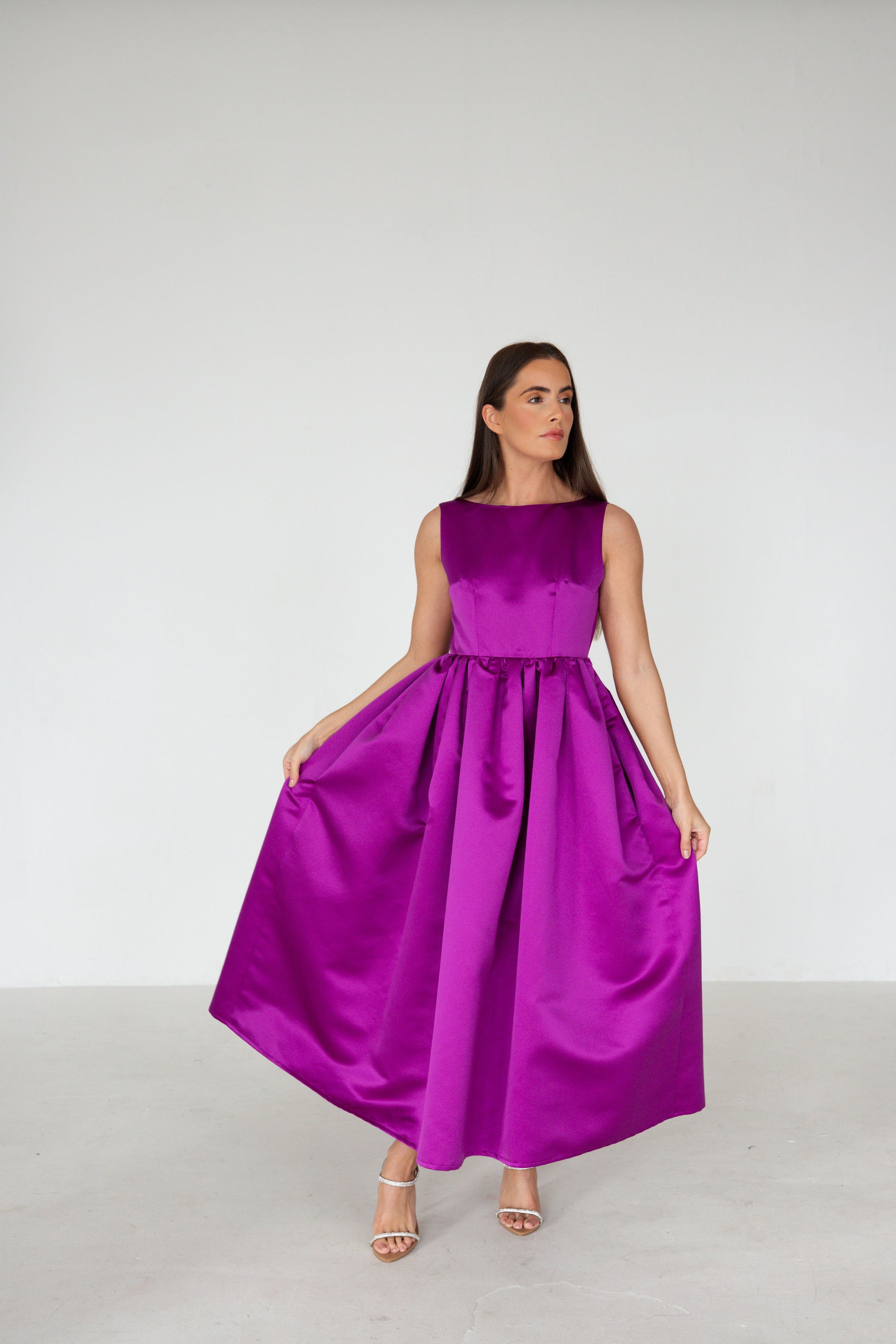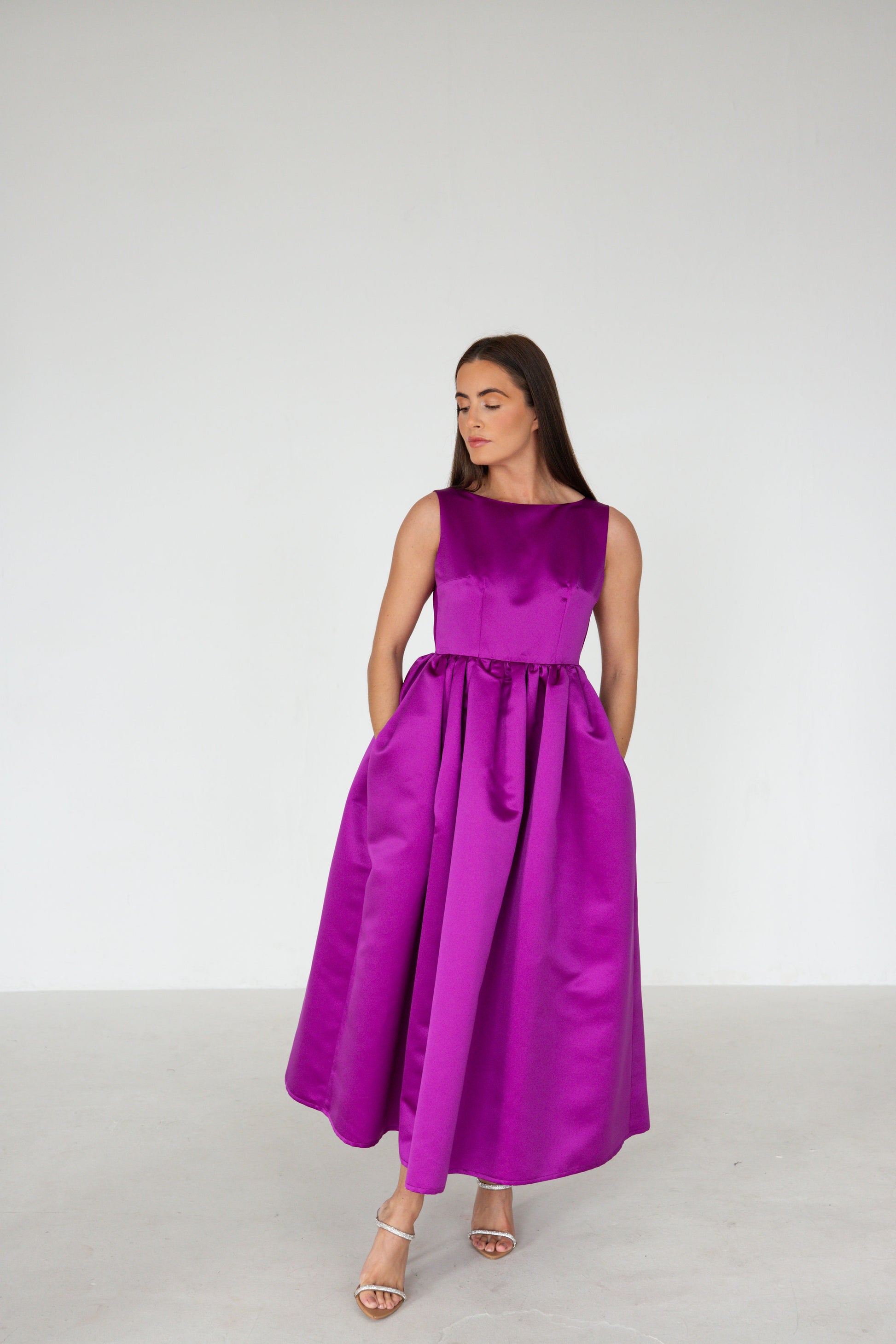 Featuring a purple heavy duchess satin. A classic boat neck, with a fixed waist and gathered skirt with side pockets.