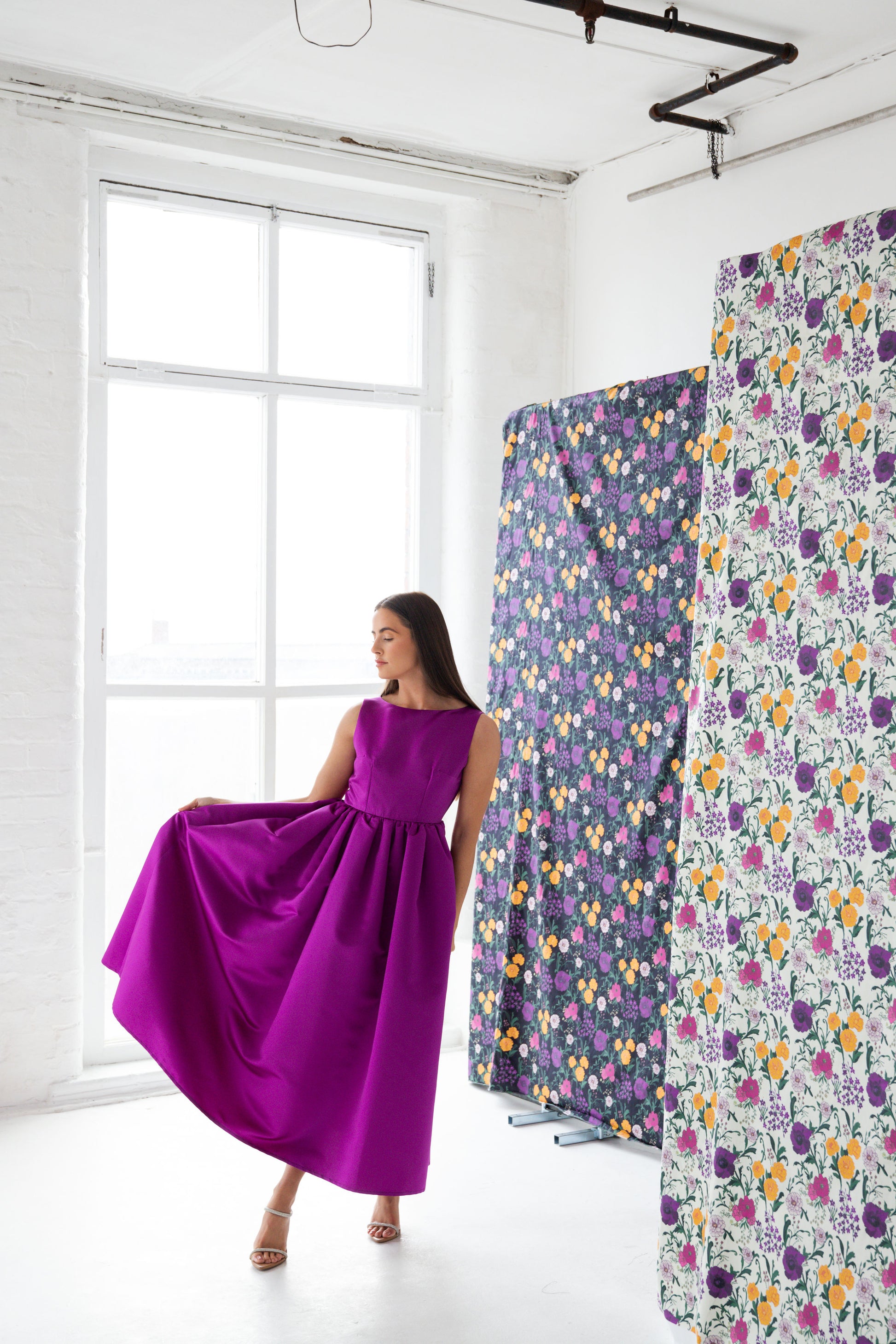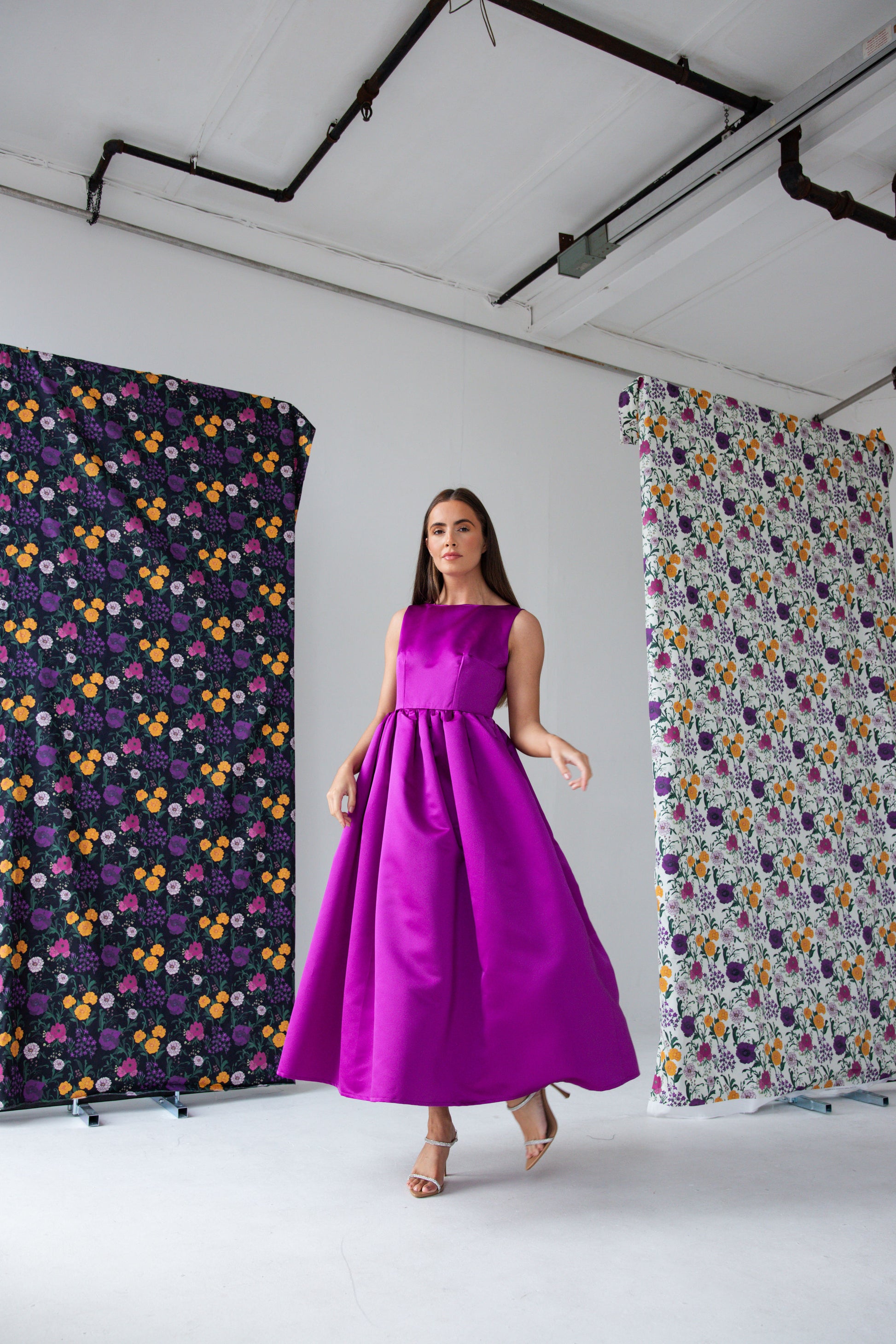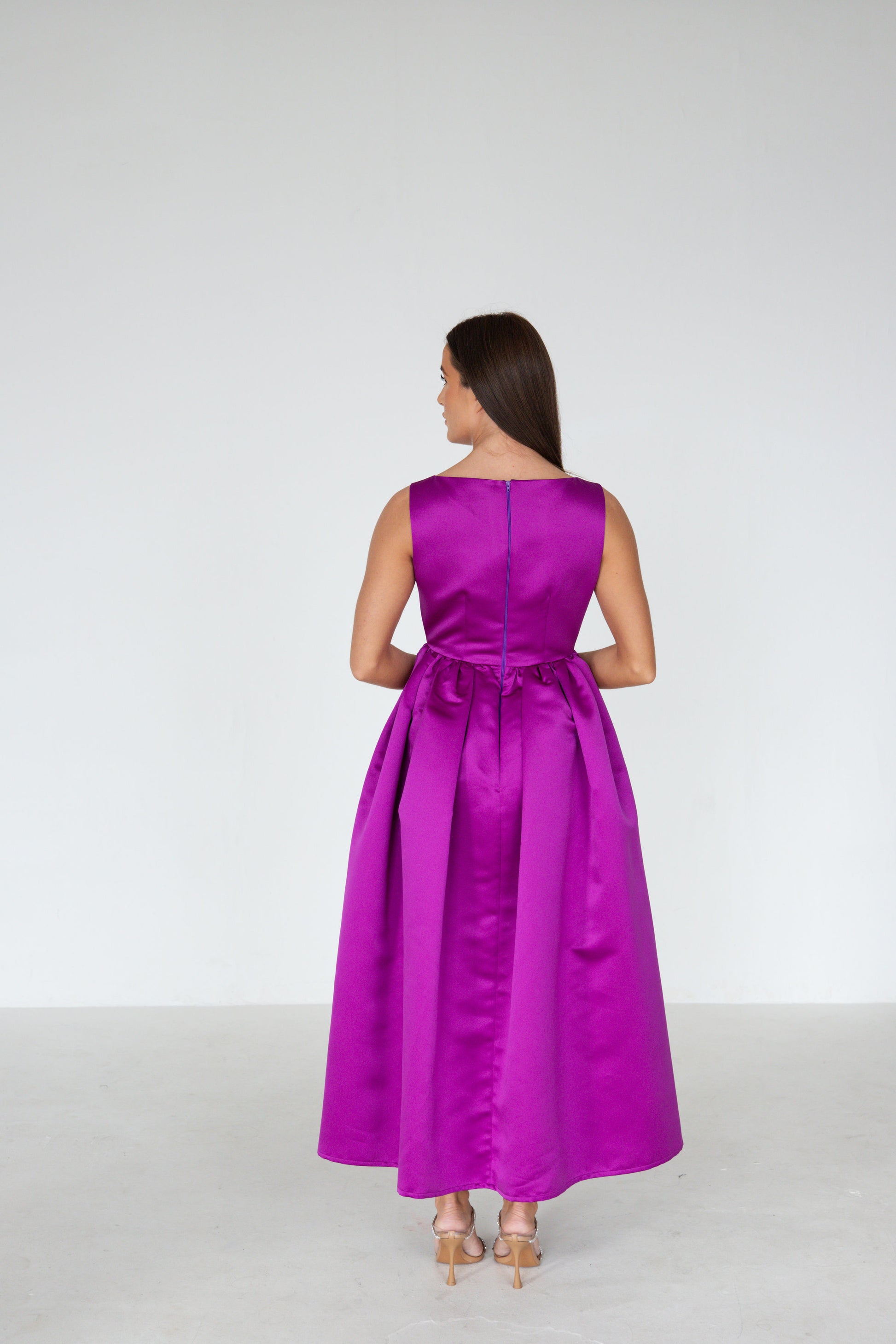 Featuring a purple heavy duchess satin. A classic boat neck, with a fixed waist and gathered skirt with side pockets.