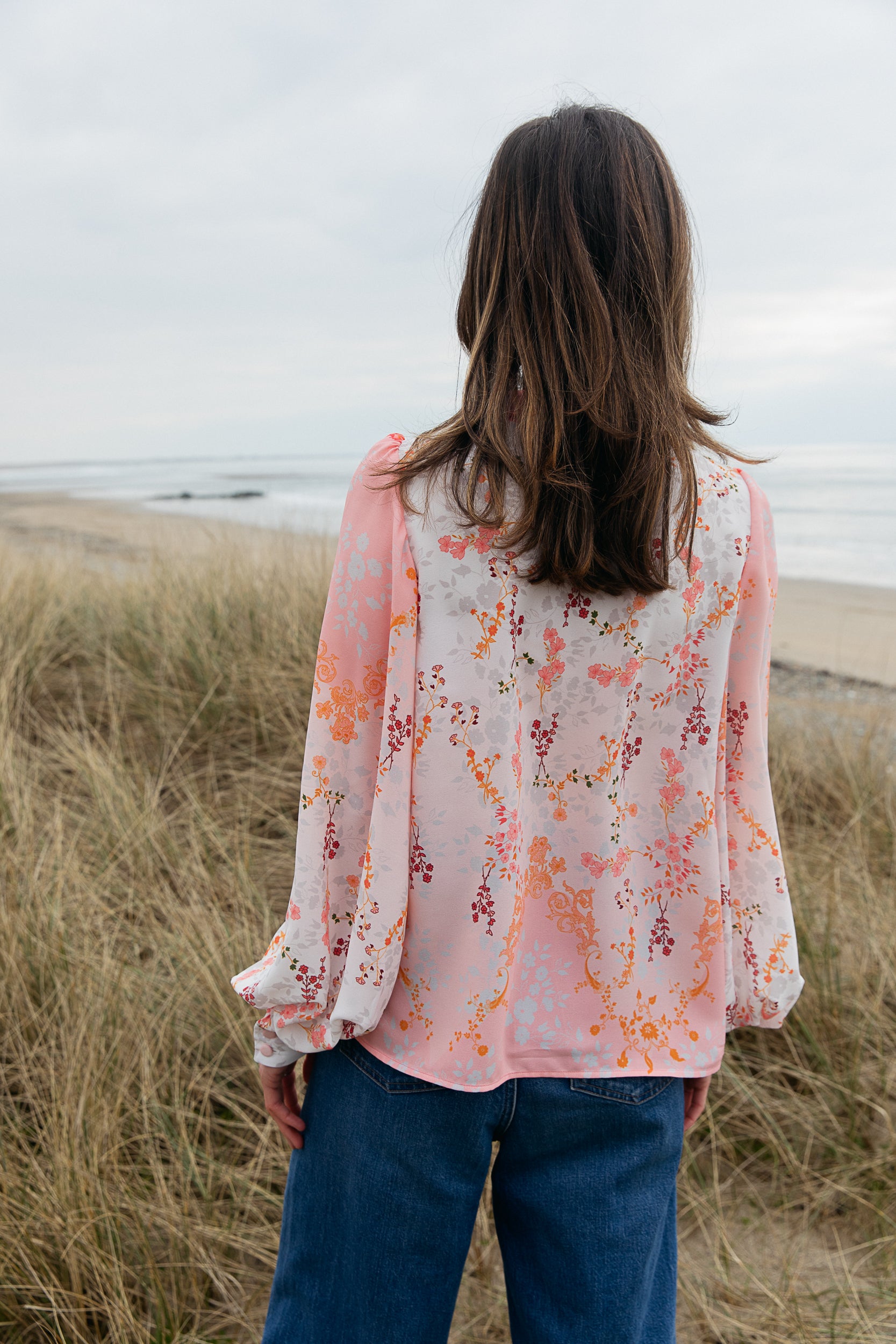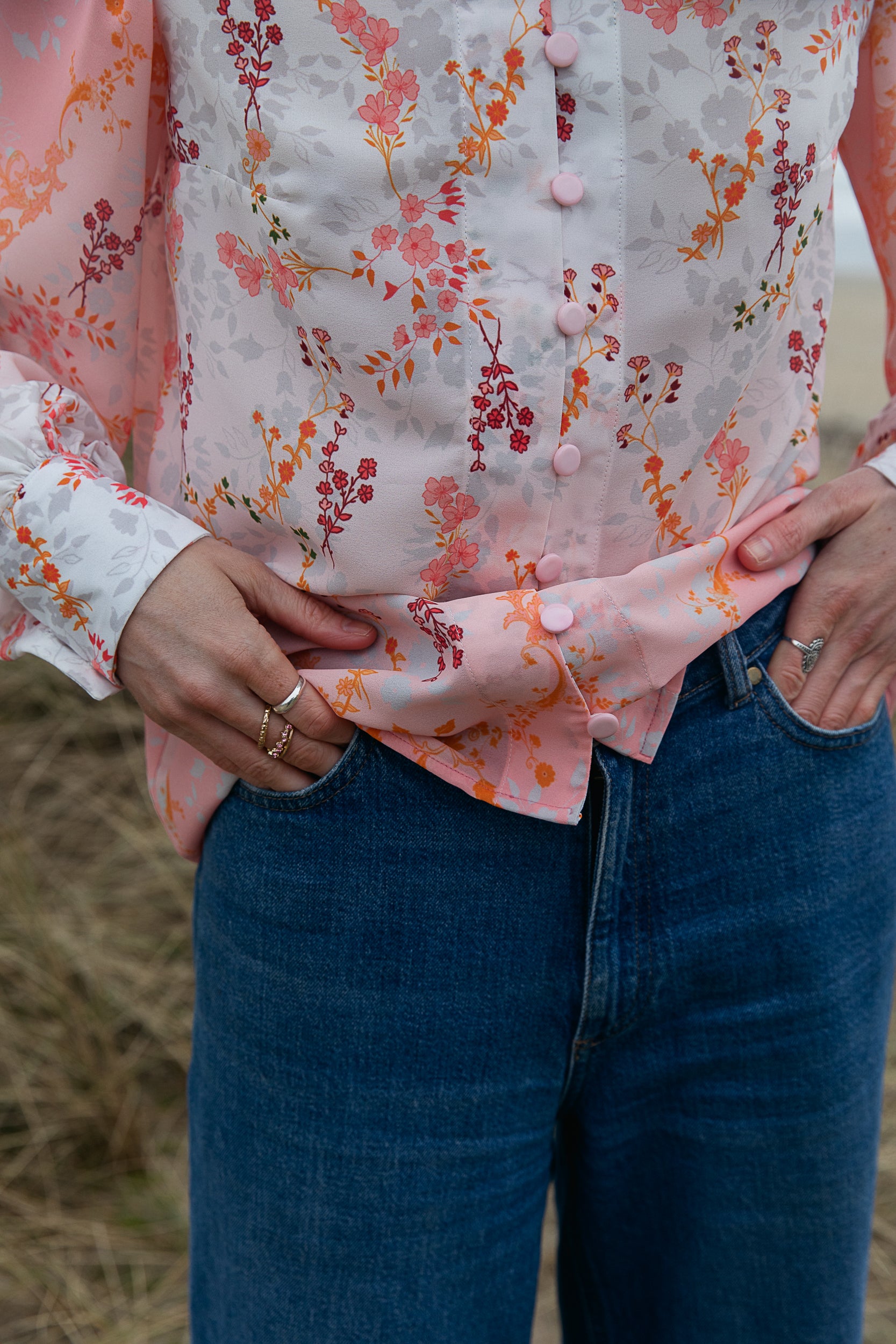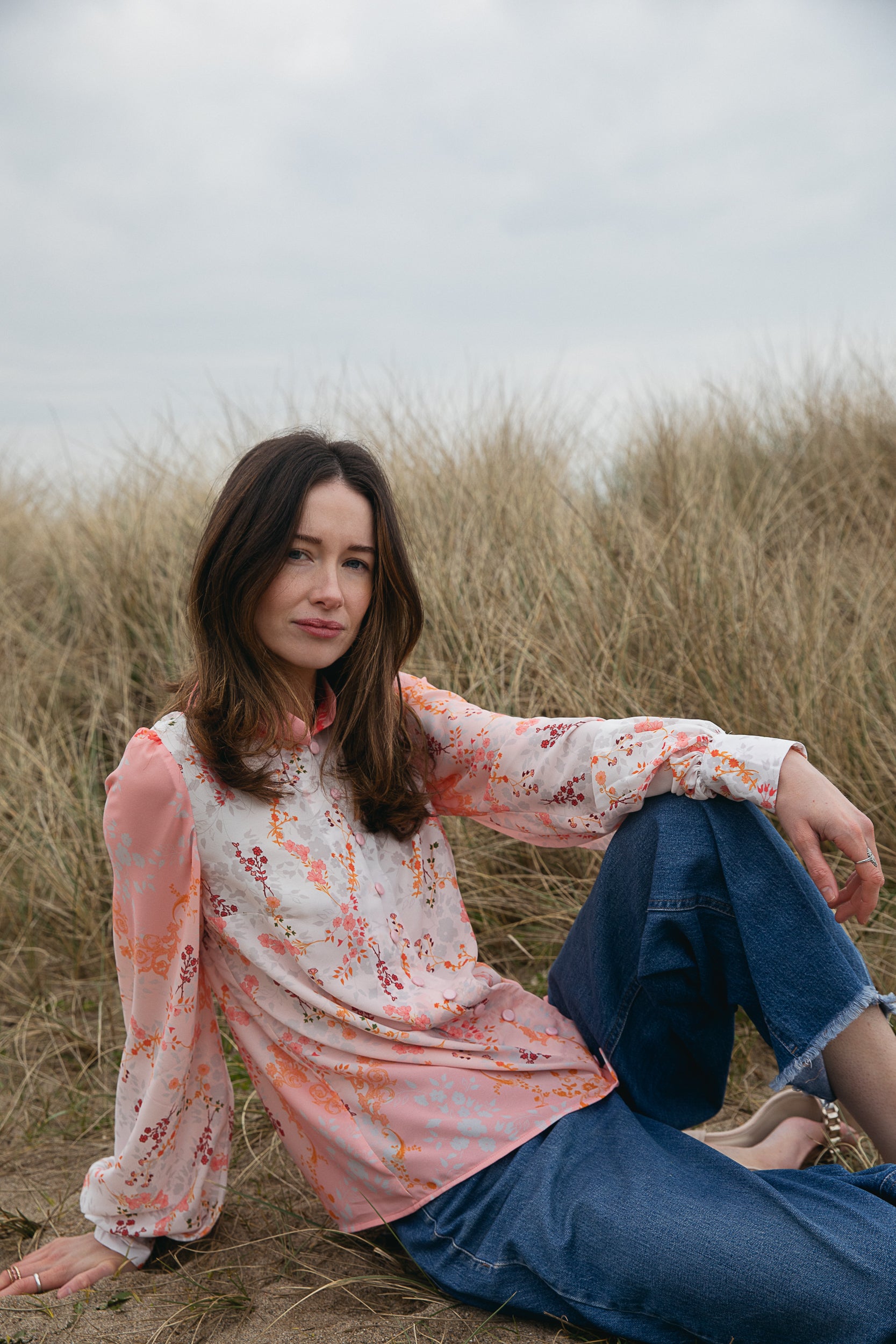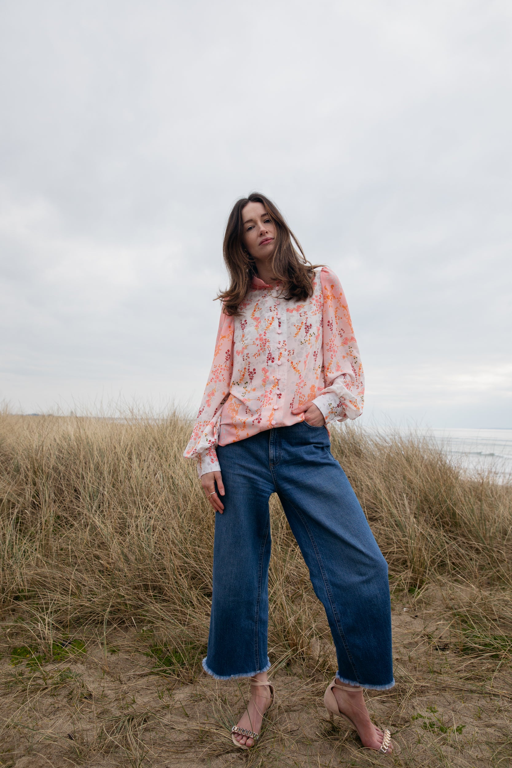 Stand out features include billowing long sleeves, stand collar and a button up front.