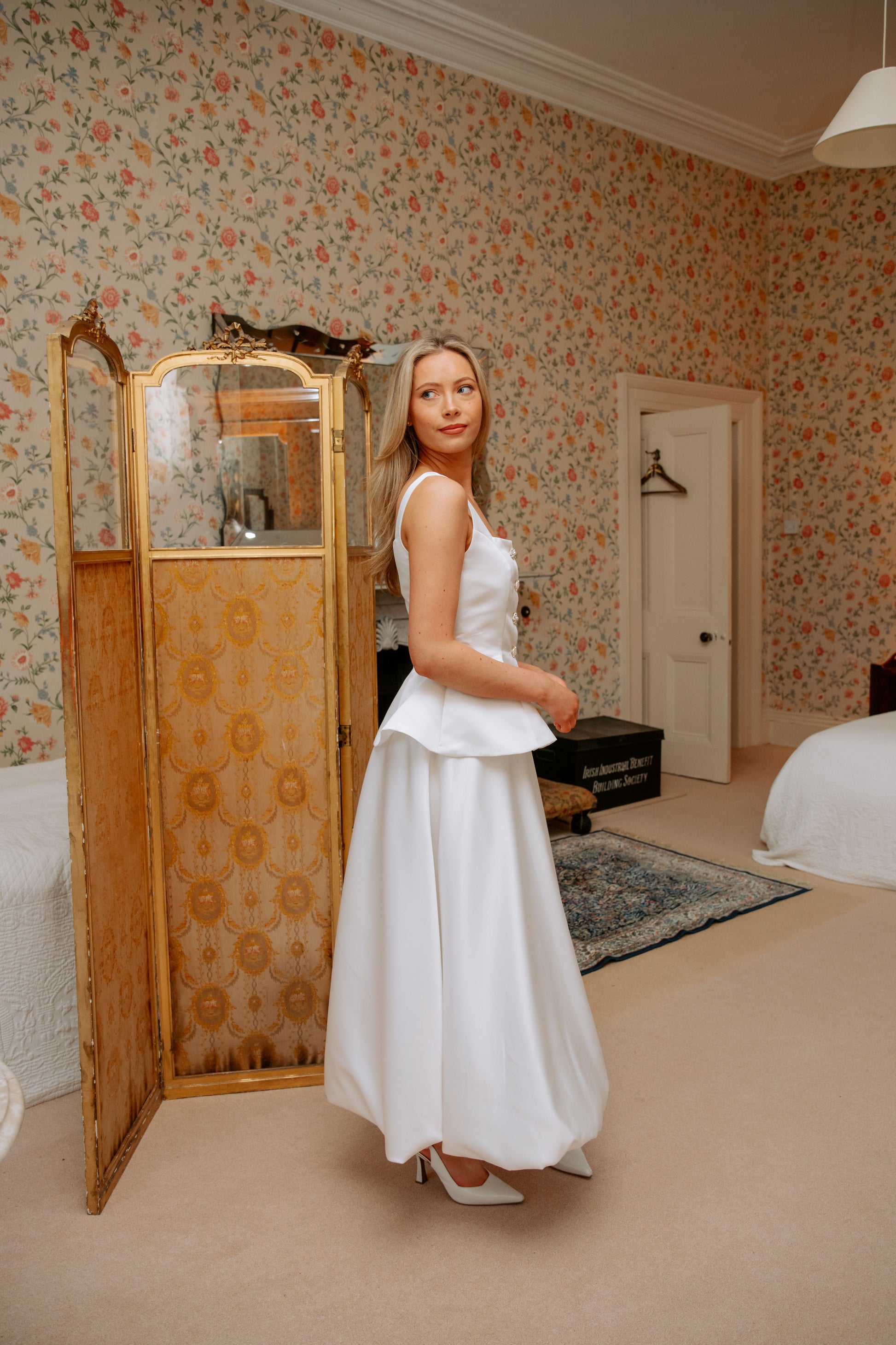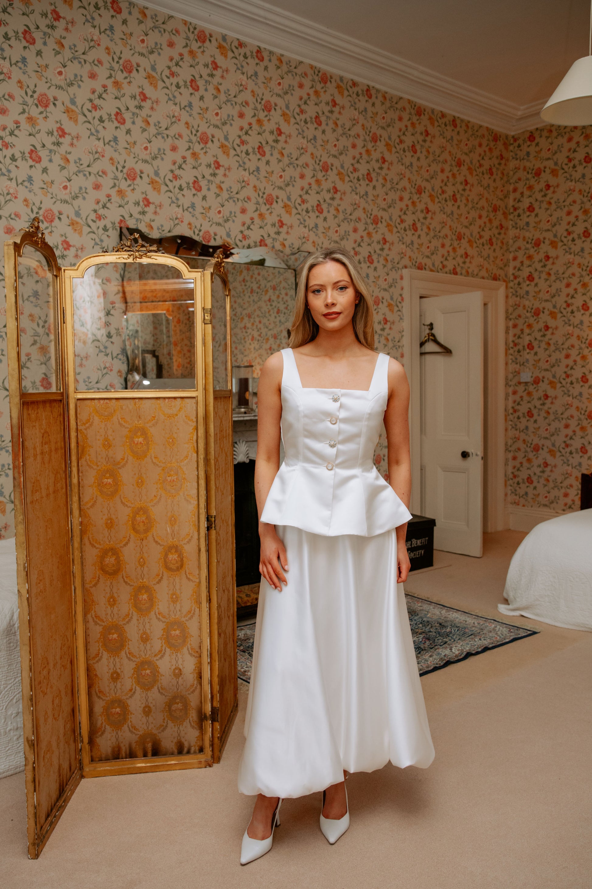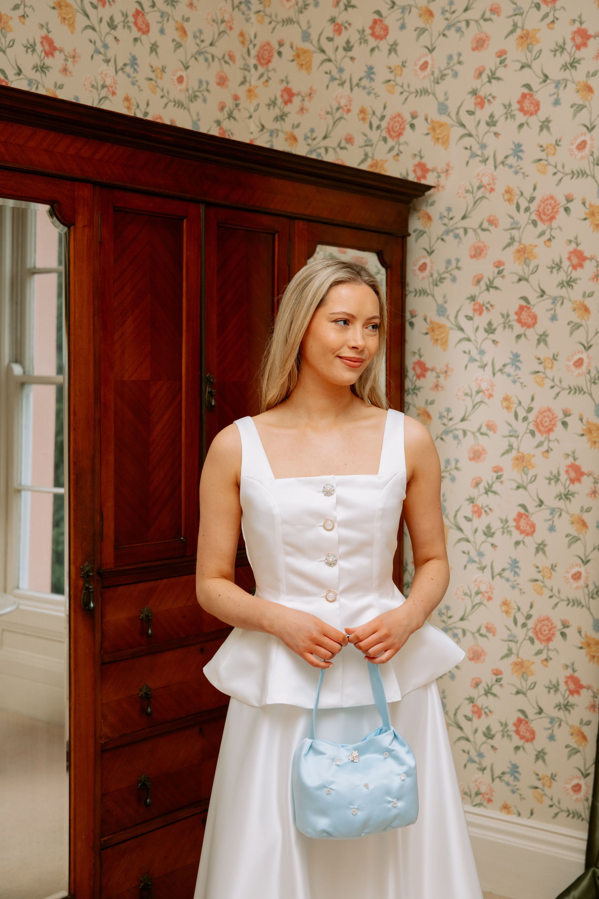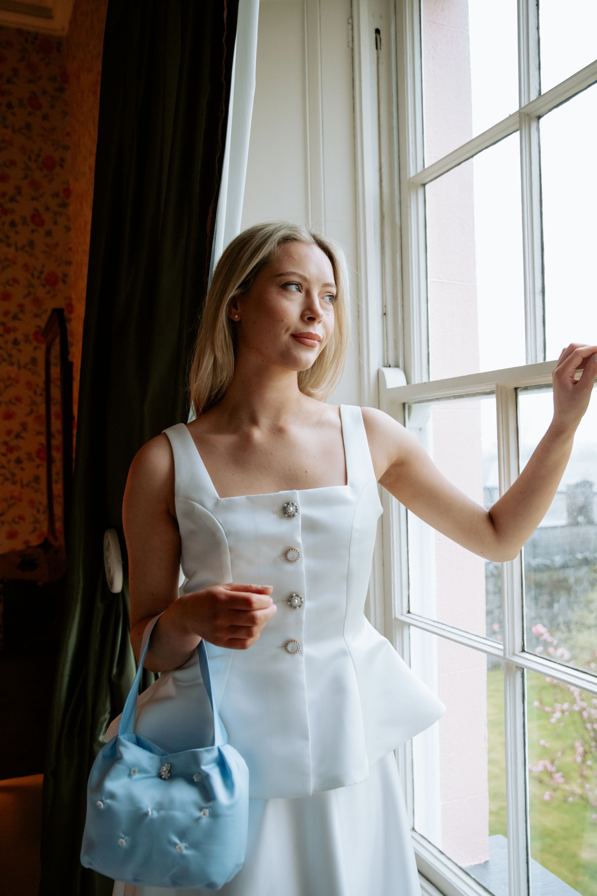 Featuring a square neckline, wide straps, peplum and an array of decorative buttons with a touch of blue.