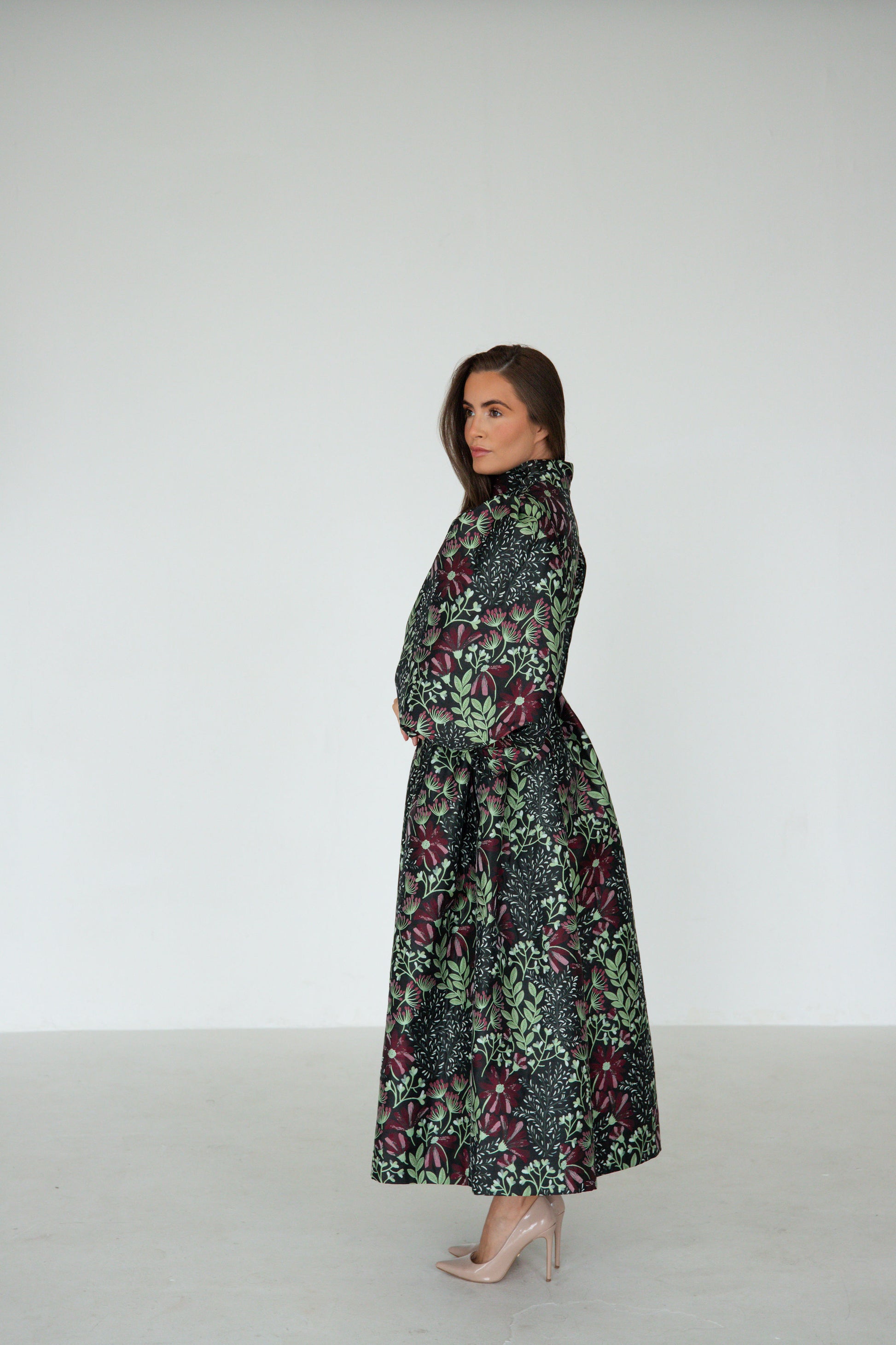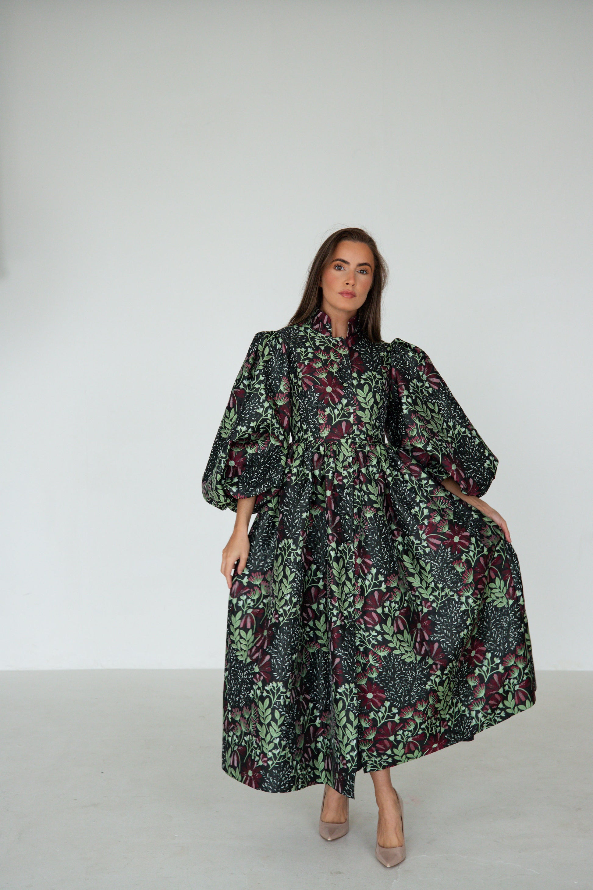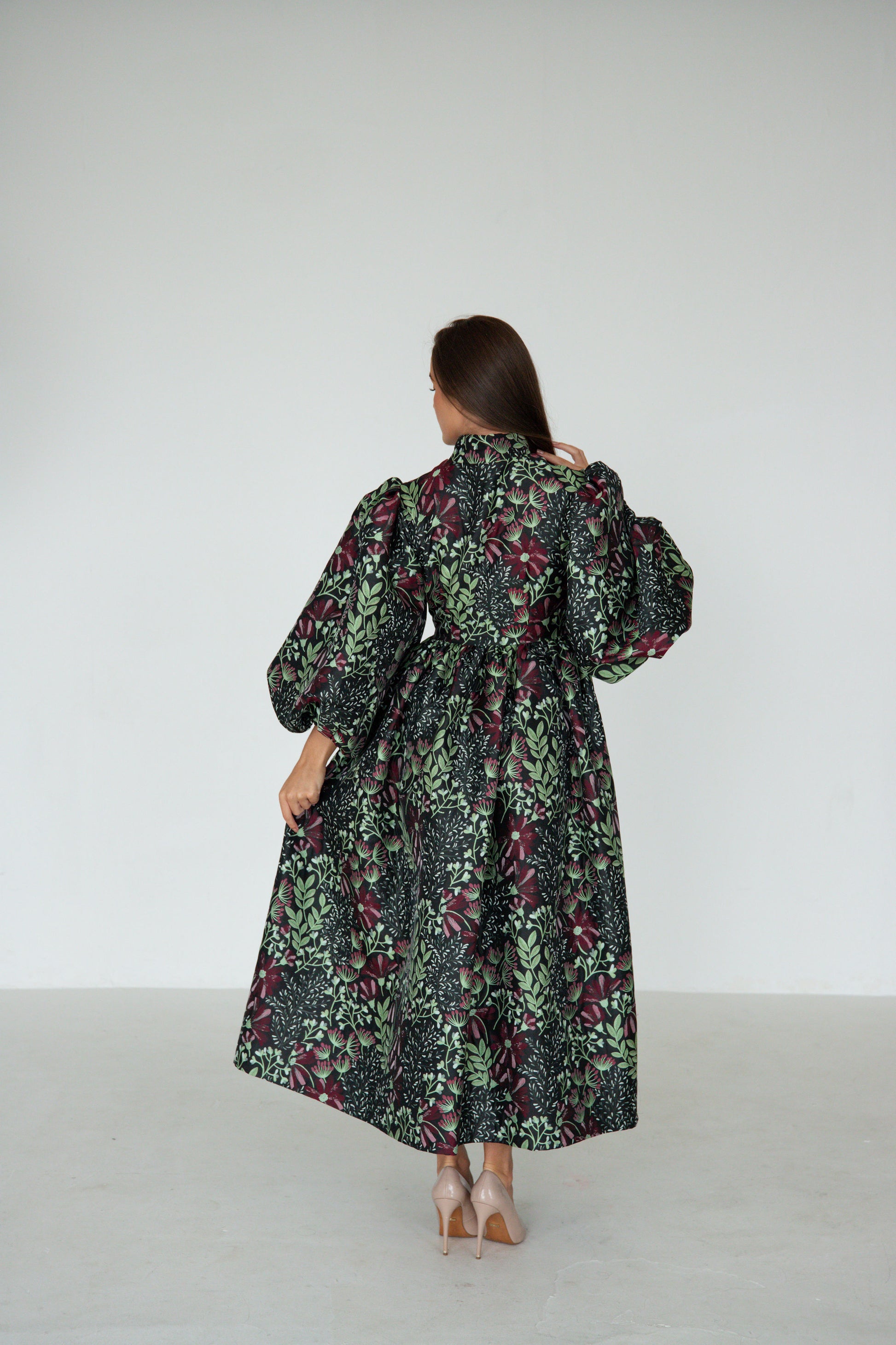 Featuring a floral jacquard. A stand collar, puff sleeves, a fixed waist and gathered skirt with side pockets.