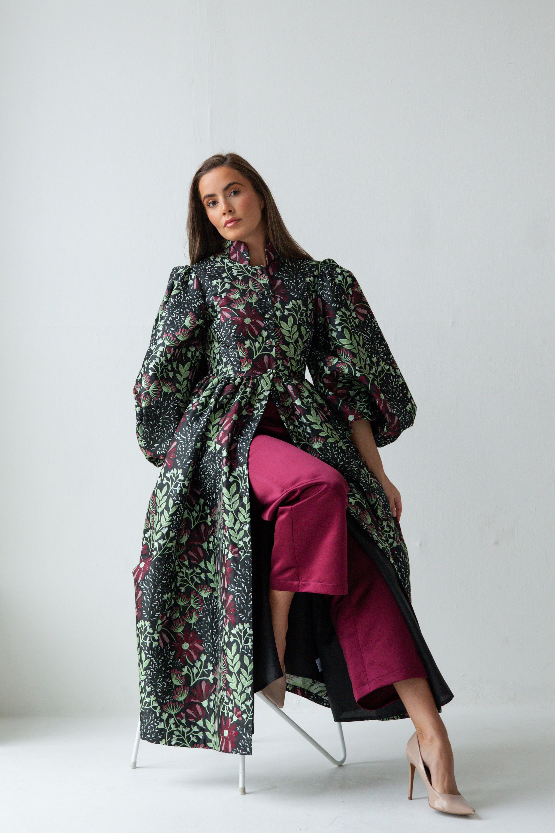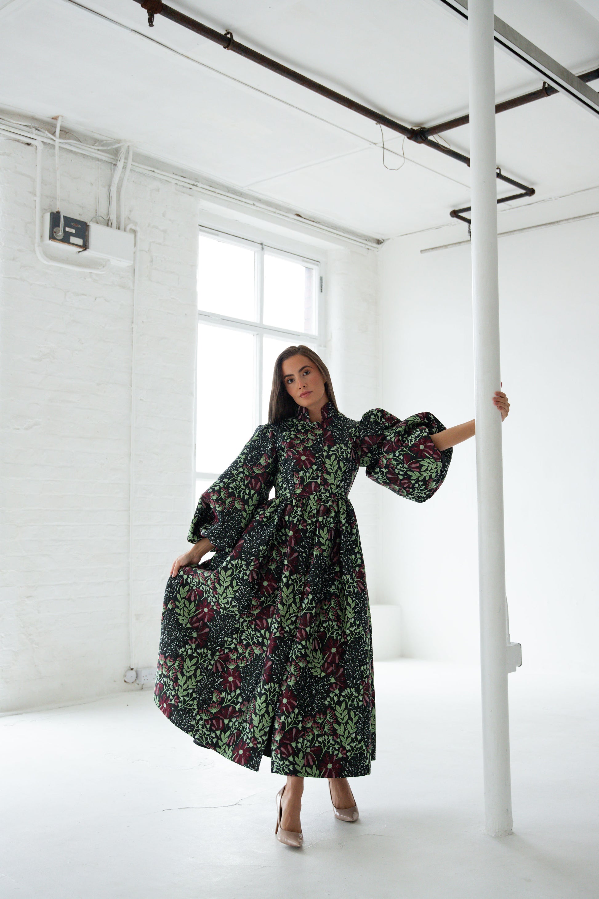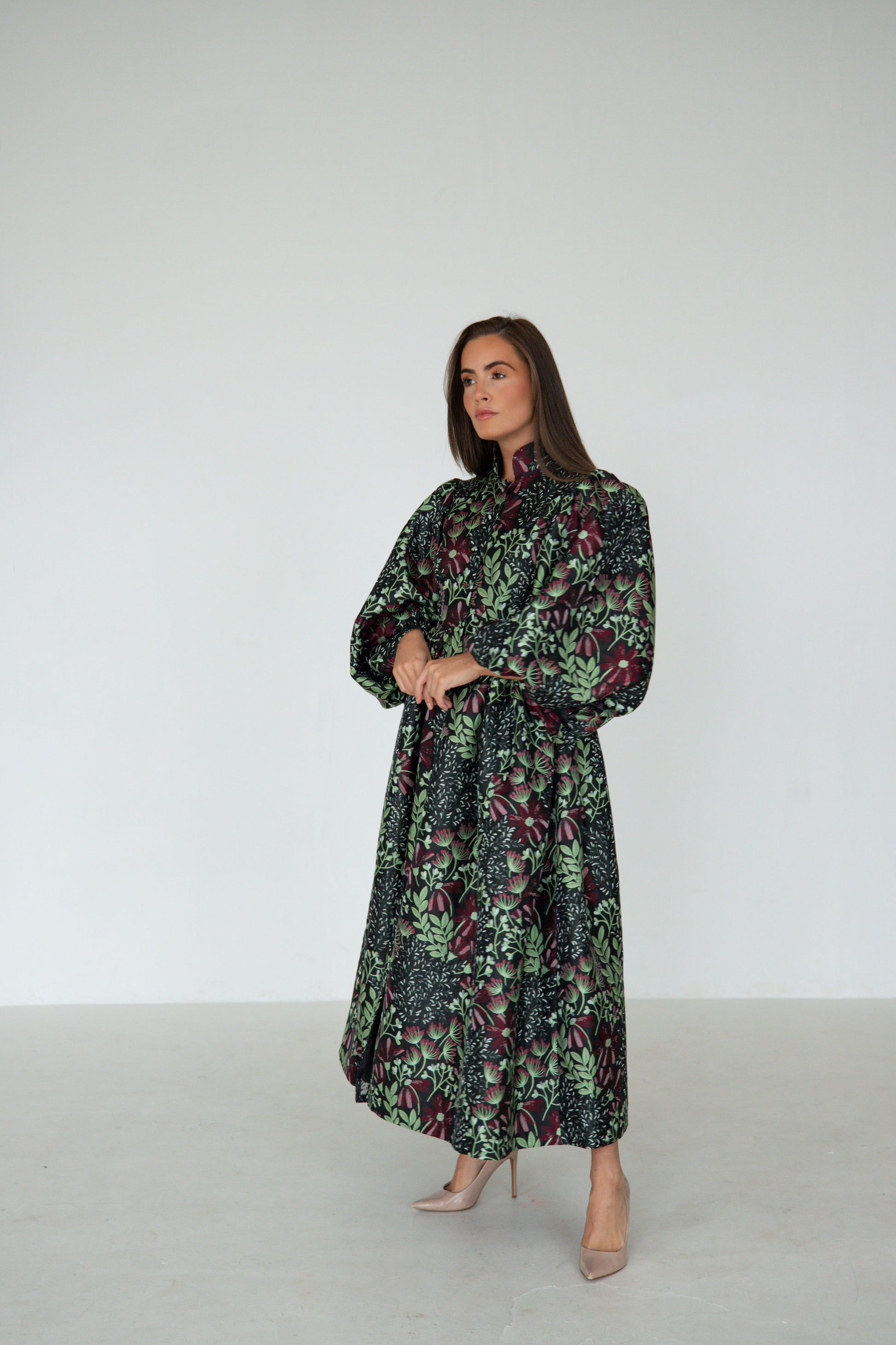 Featuring a floral jacquard. A stand collar, puff sleeves, a fixed waist and gathered skirt with side pockets.