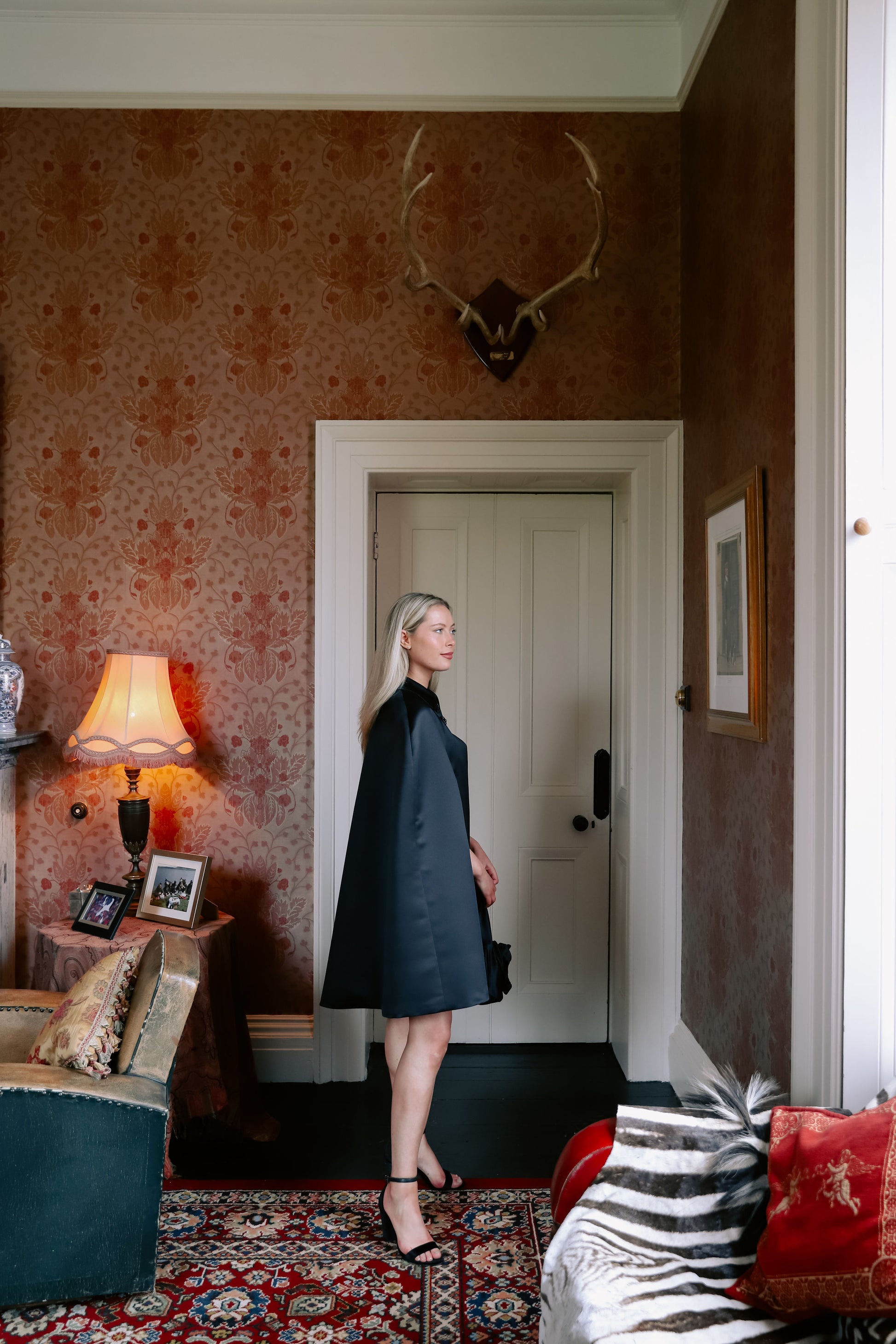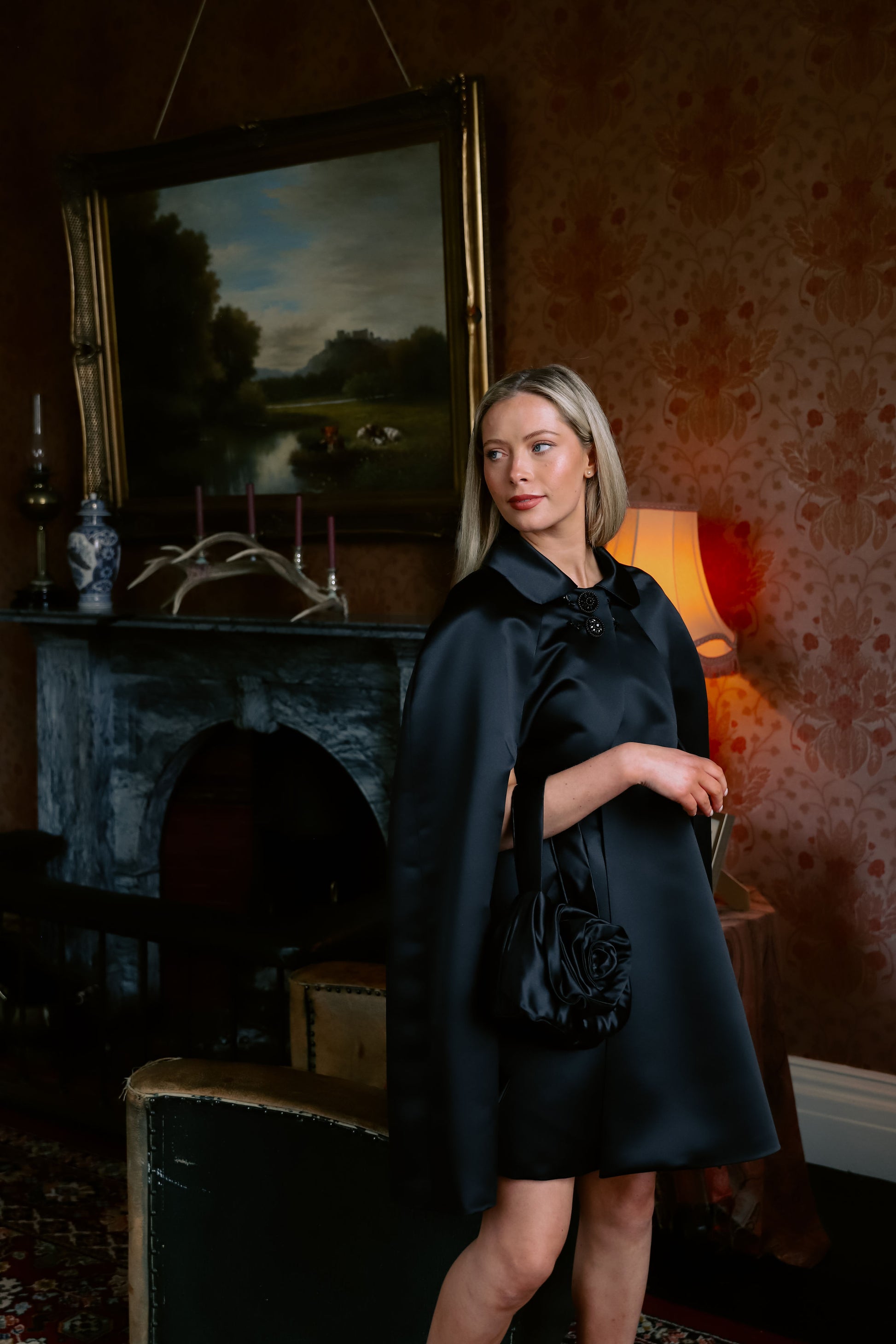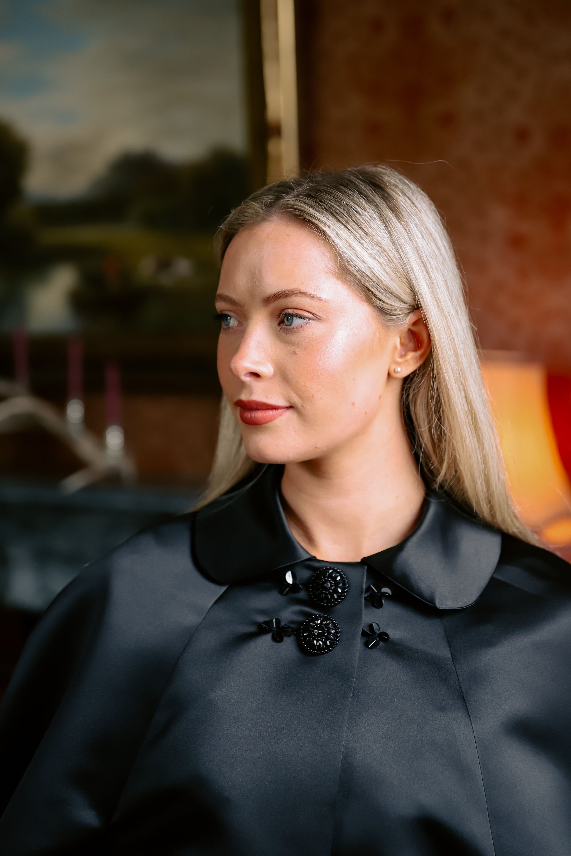 Our Kate Embellished Cape is a statement piece designed to be both dramatic and versatile, it pairs beautifully with a little black dress or tailored separates. Crafted from luxurious duchess satin with a lustrous sheen, this elegant piece drapes effortlessly over the shoulders, creating a refined silhouette. The cape features a peter-pan collar and intricate jewel-like button closures finished with palette embellished details, adding a touch of glamour.