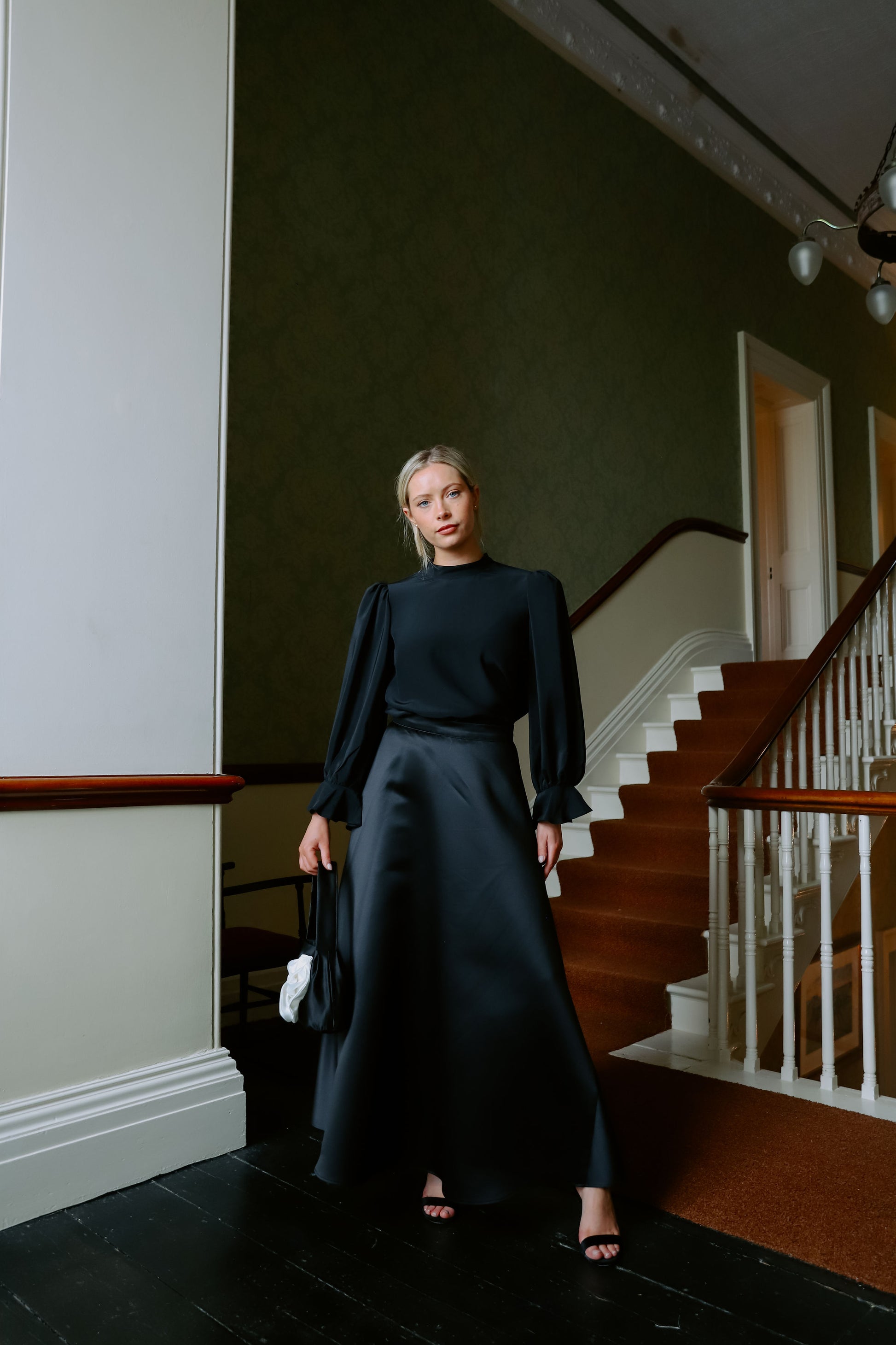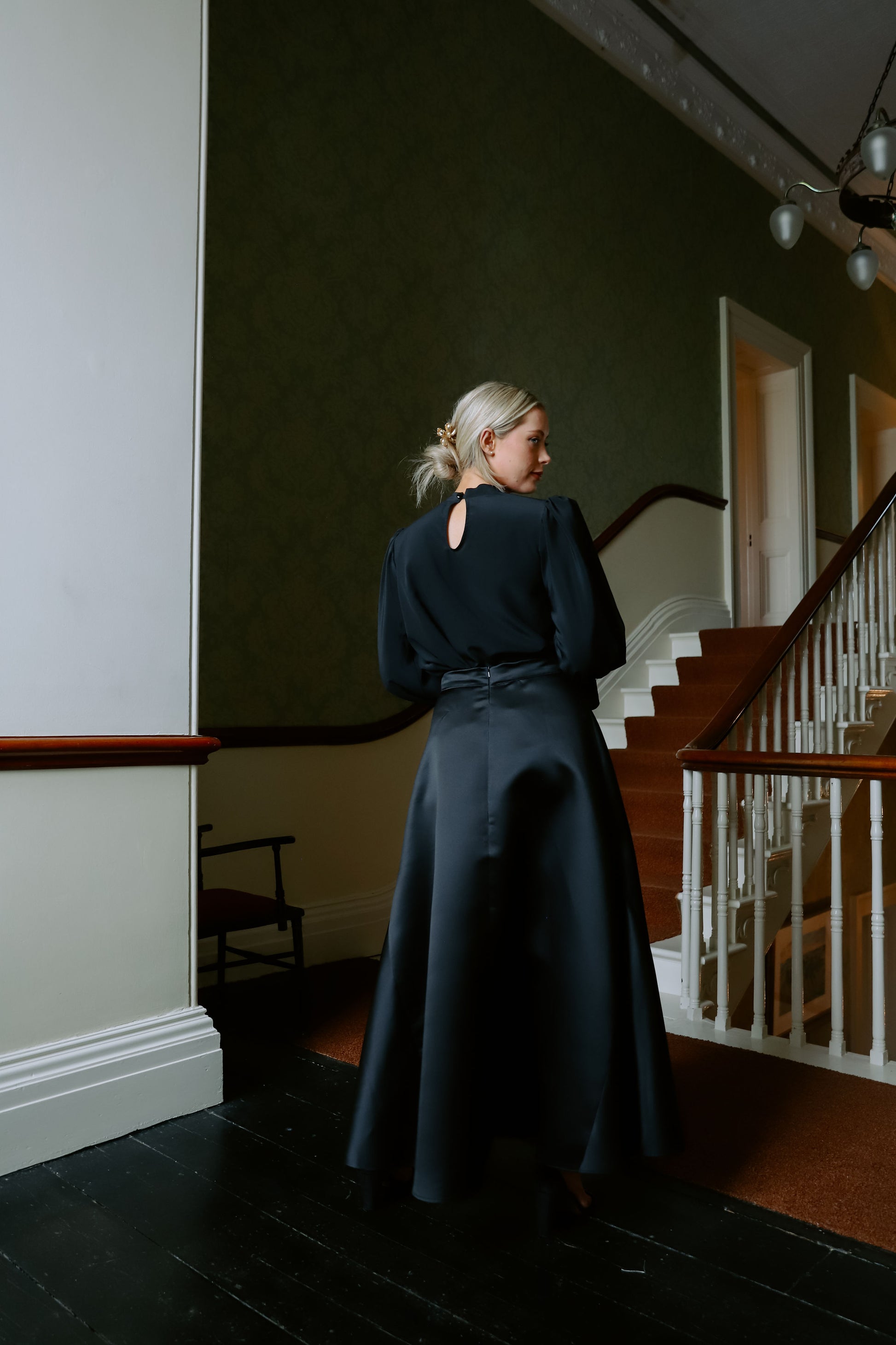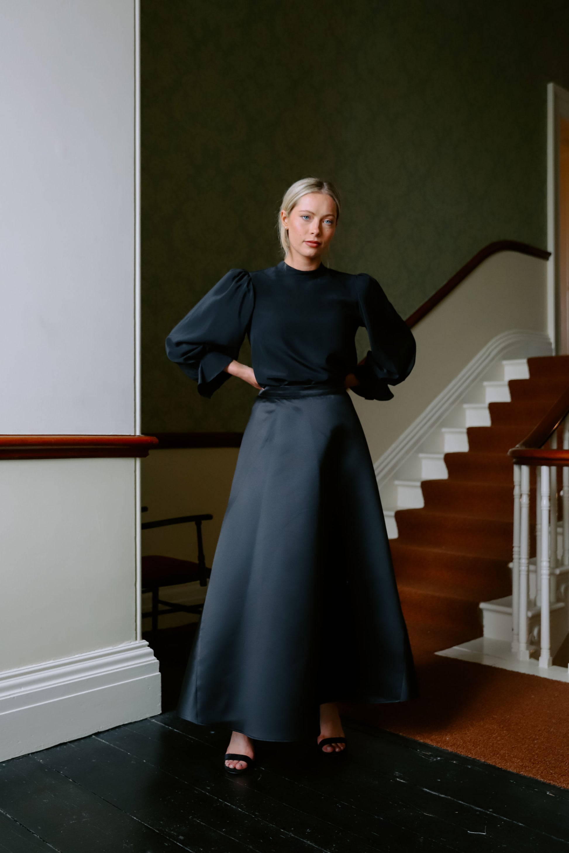 Elevate your evening-wear with our elegant Kate Skirt in a timeless Black. Crafted from a luxurious duchess satin fabric, this skirt flows effortlessly from a cinched waist into a structured A-line silhouette that flatters every figure. The smooth sheen of the fabric adds a refined touch, making it the perfect piece for formal occasions, elegant dinners, or black-tie events.