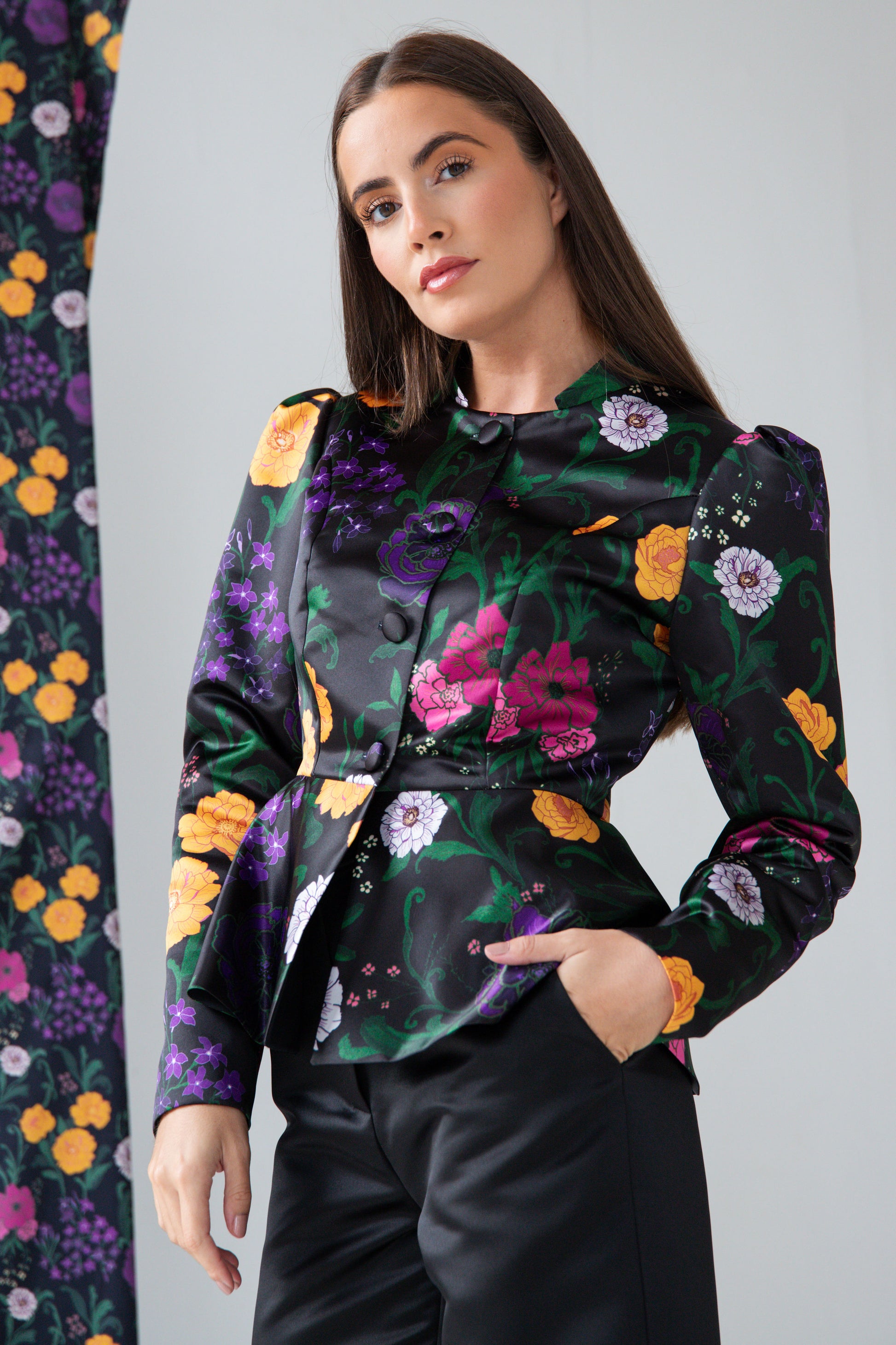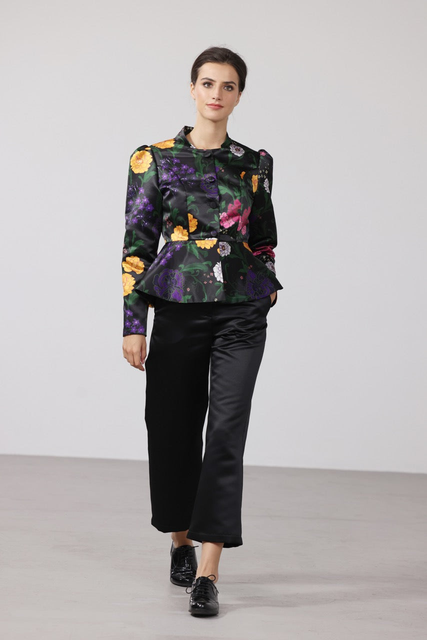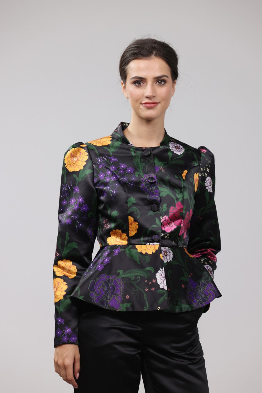 Featuring a hand drawn print, printed onto a heavy duchess satin. Stand collar, peplum and covered buttons.