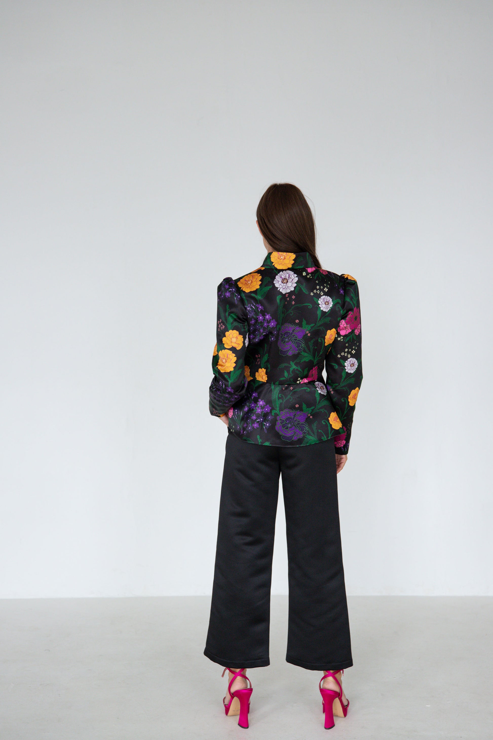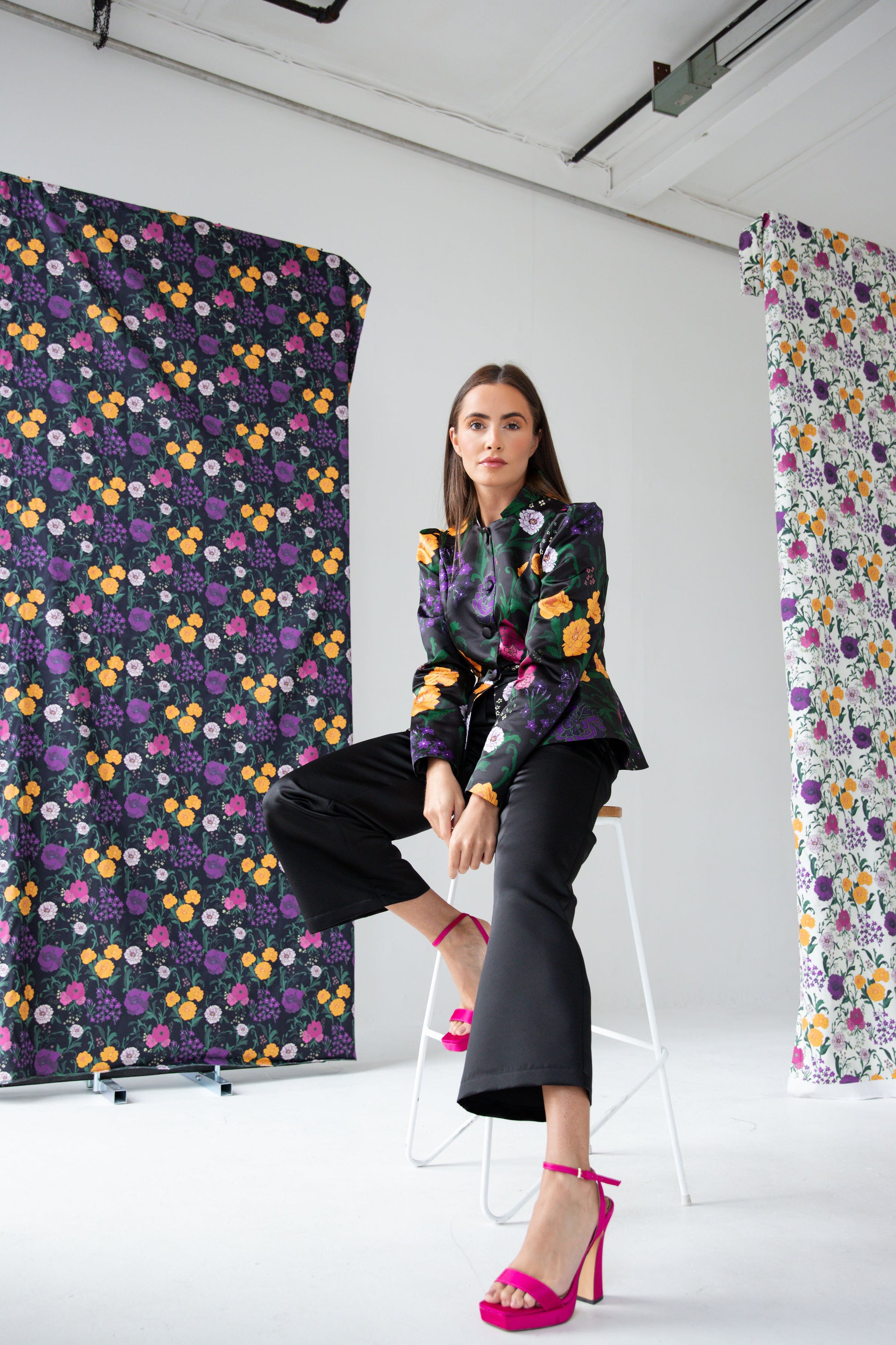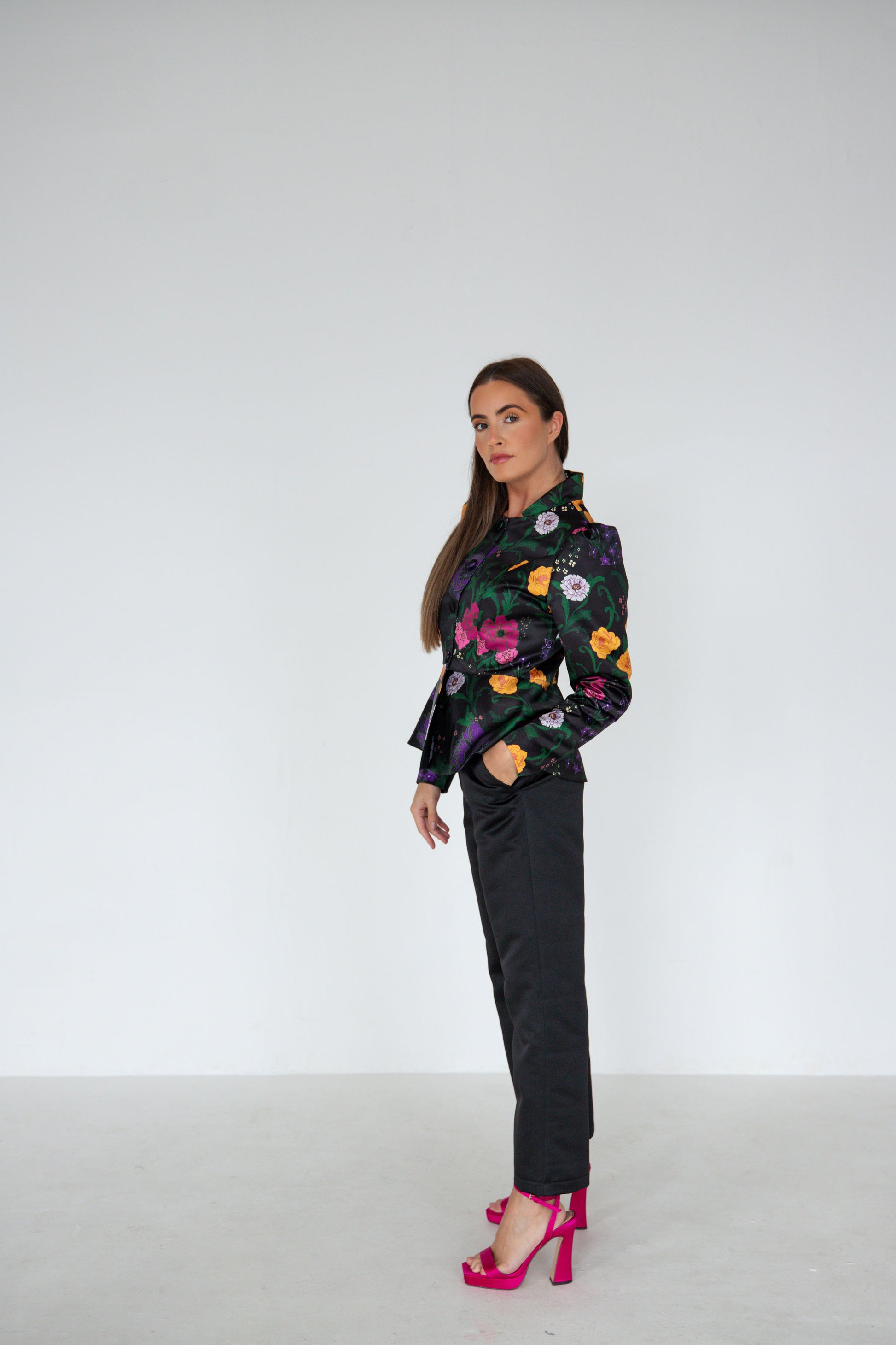 Featuring a hand drawn print, printed onto a heavy duchess satin. Stand collar, peplum and covered buttons.