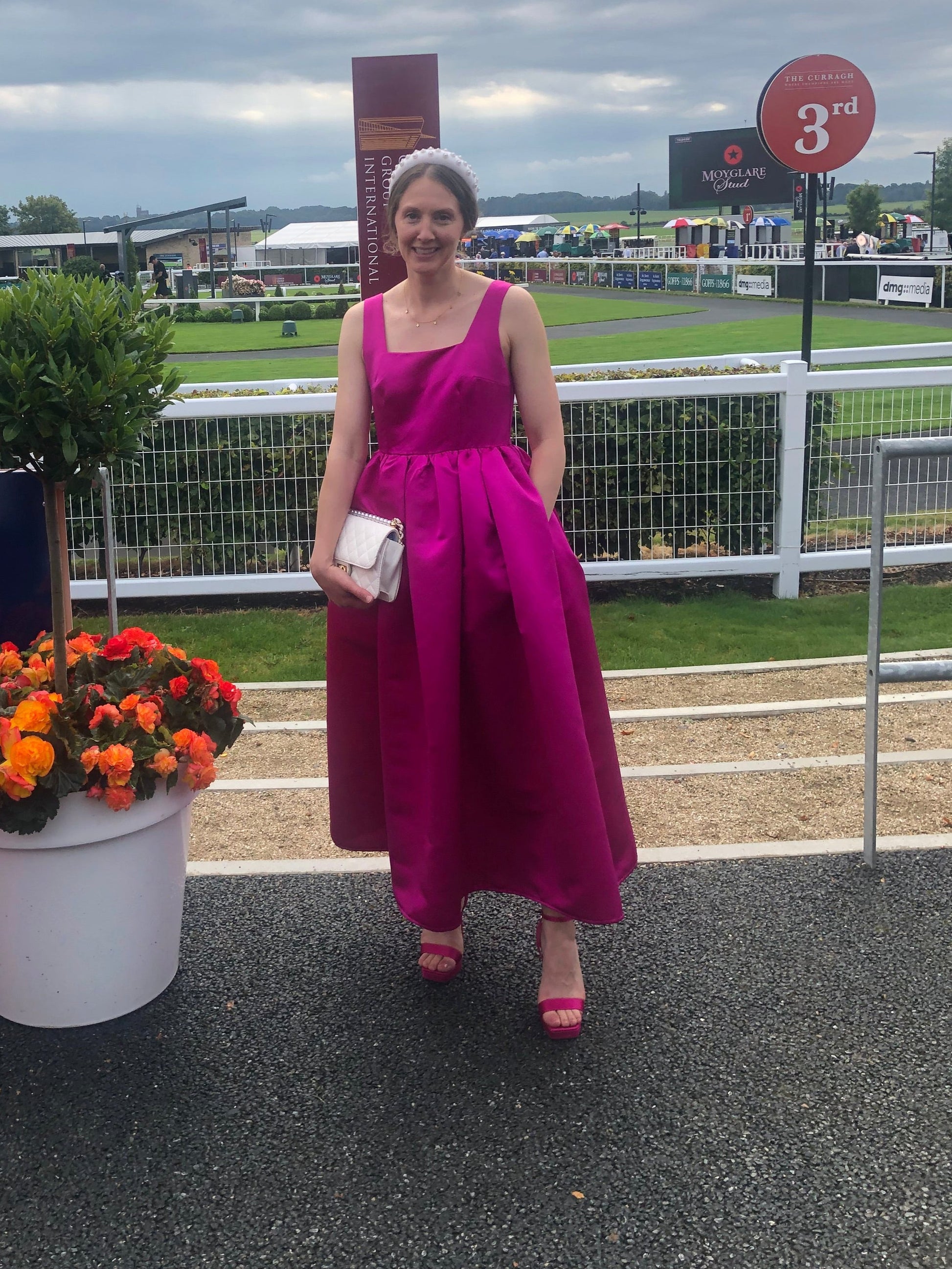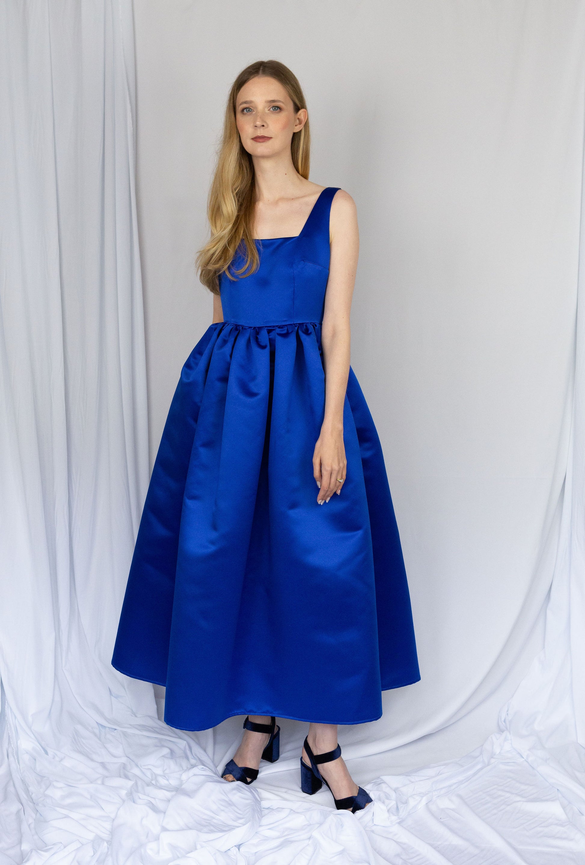 Make a statement in the Blue Tulip Satin dress. Featuring a square neck, wide straps and full mid length skirt with side pockets. Photographed here with the Jane Jacket.