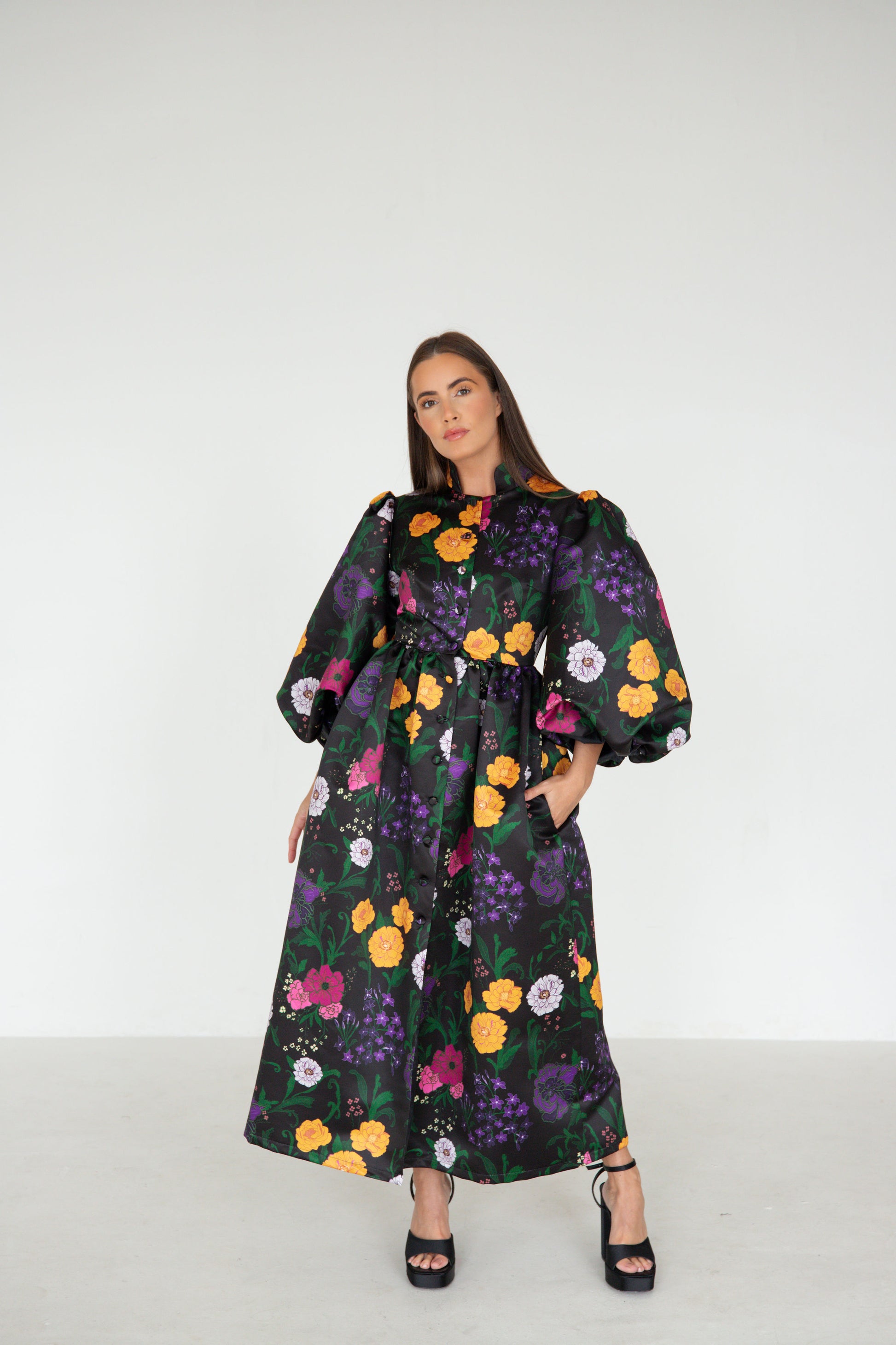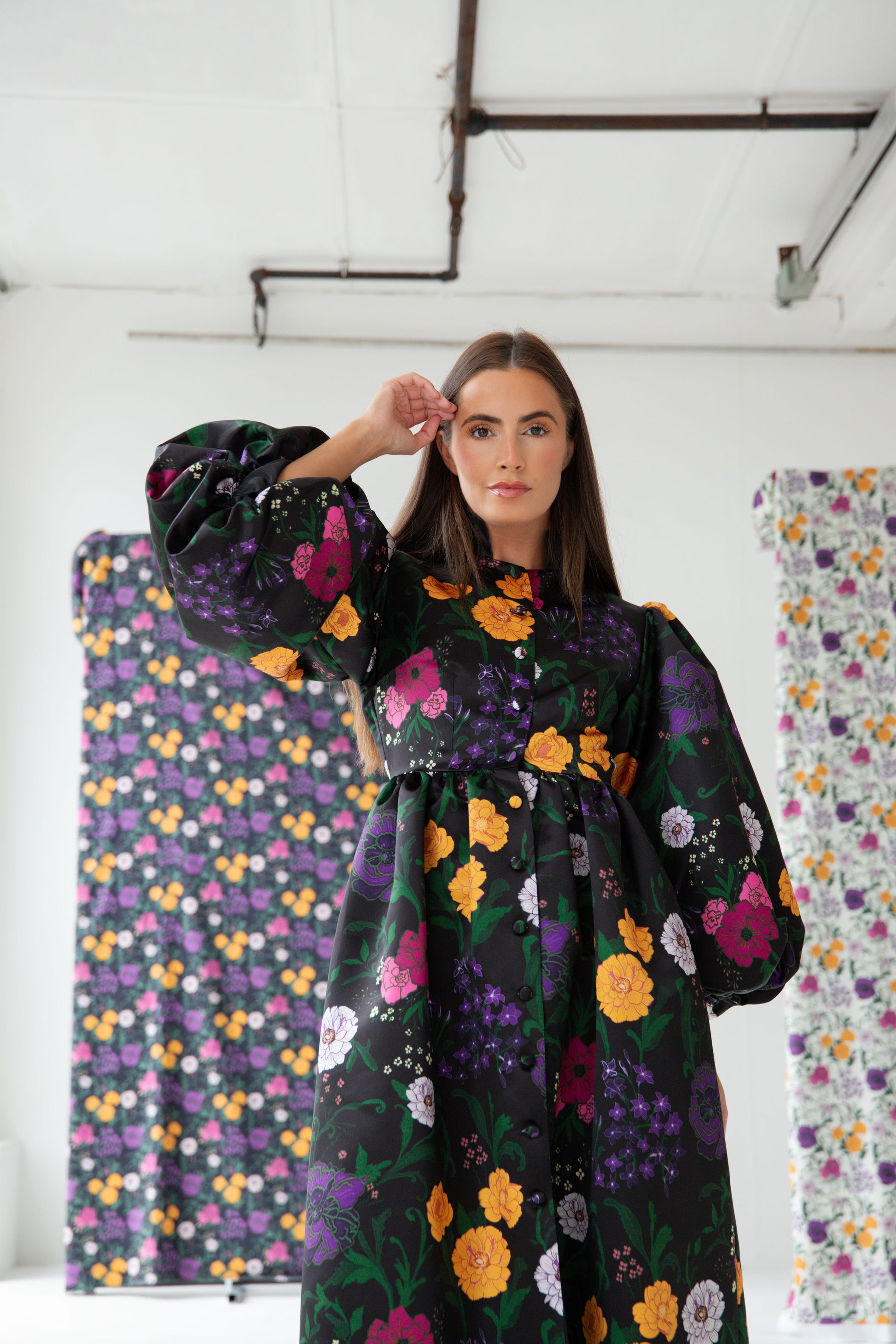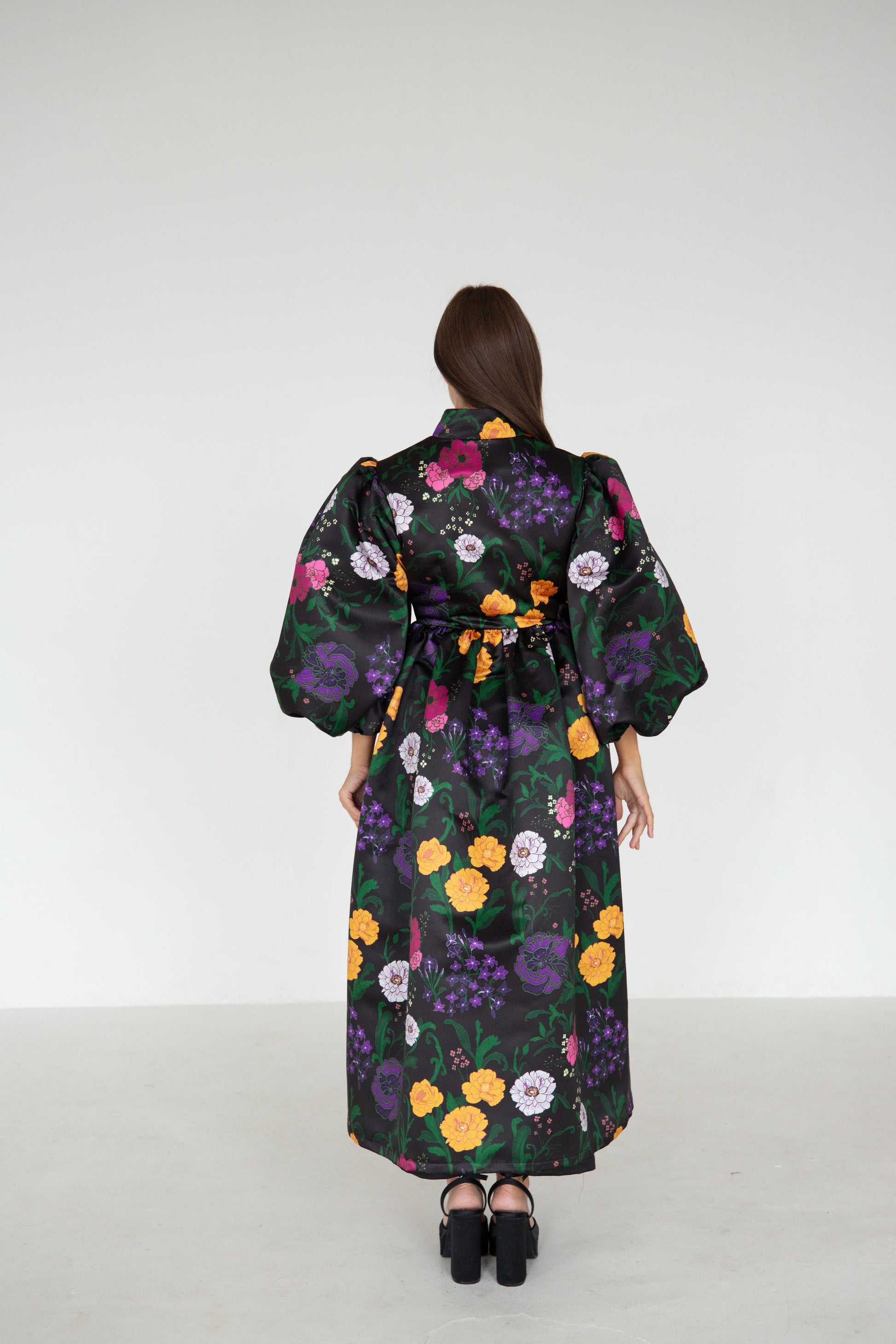 Featuring a hand drawn floral print on a heavy duchess satin. A stand collar, puff sleeves, a fixed waist and gathered skirt with side pockets.