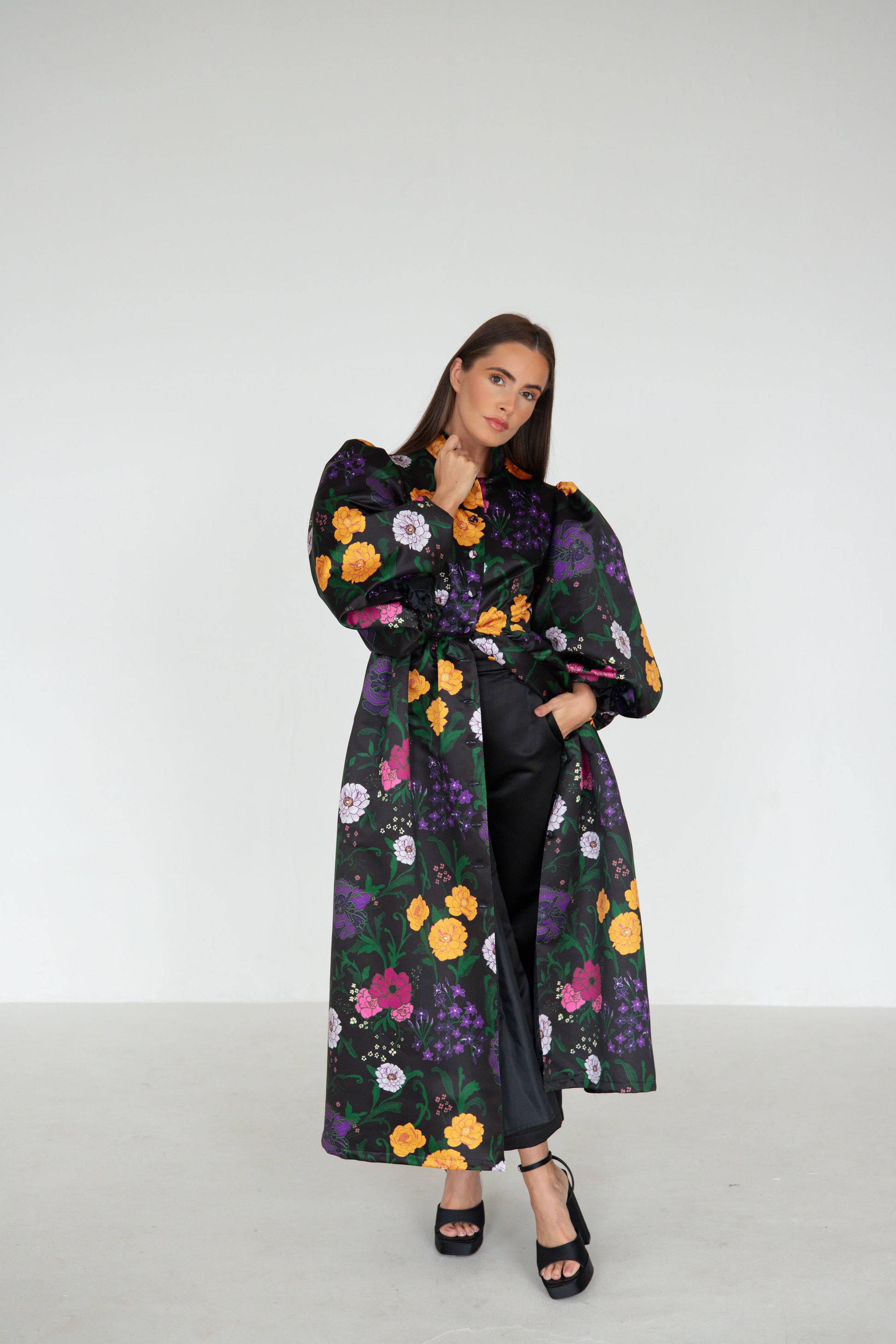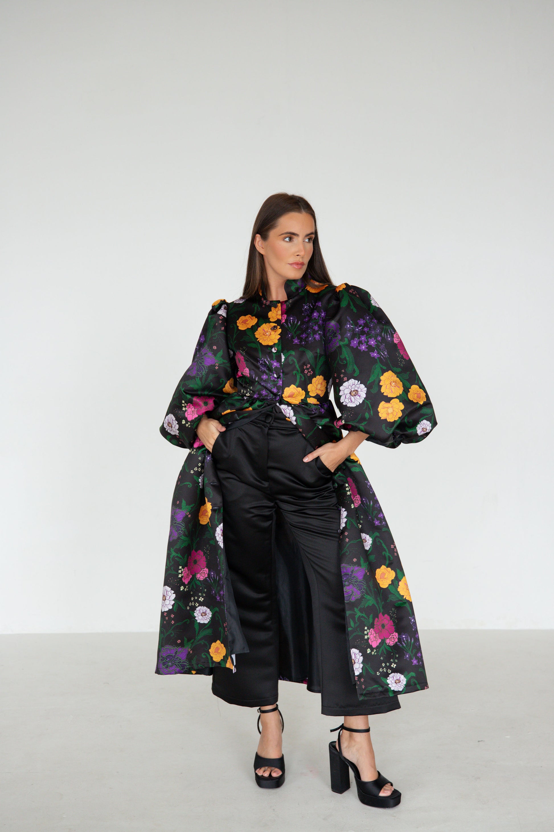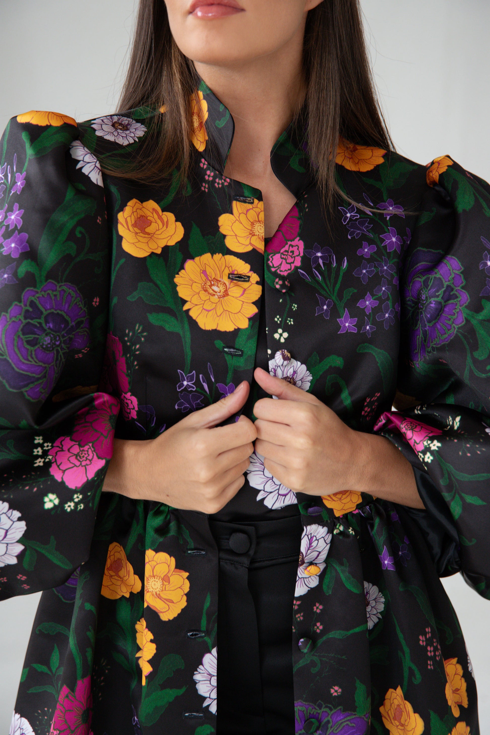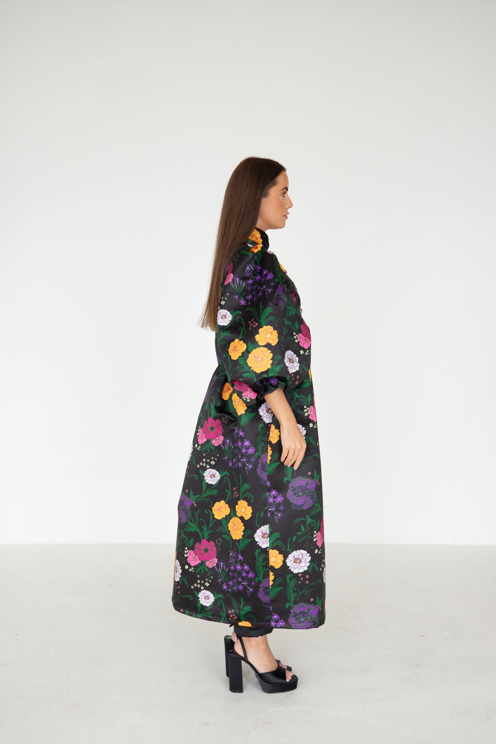 Featuring a hand drawn floral print on a heavy duchess satin. A stand collar, puff sleeves, a fixed waist and gathered skirt with side pockets.