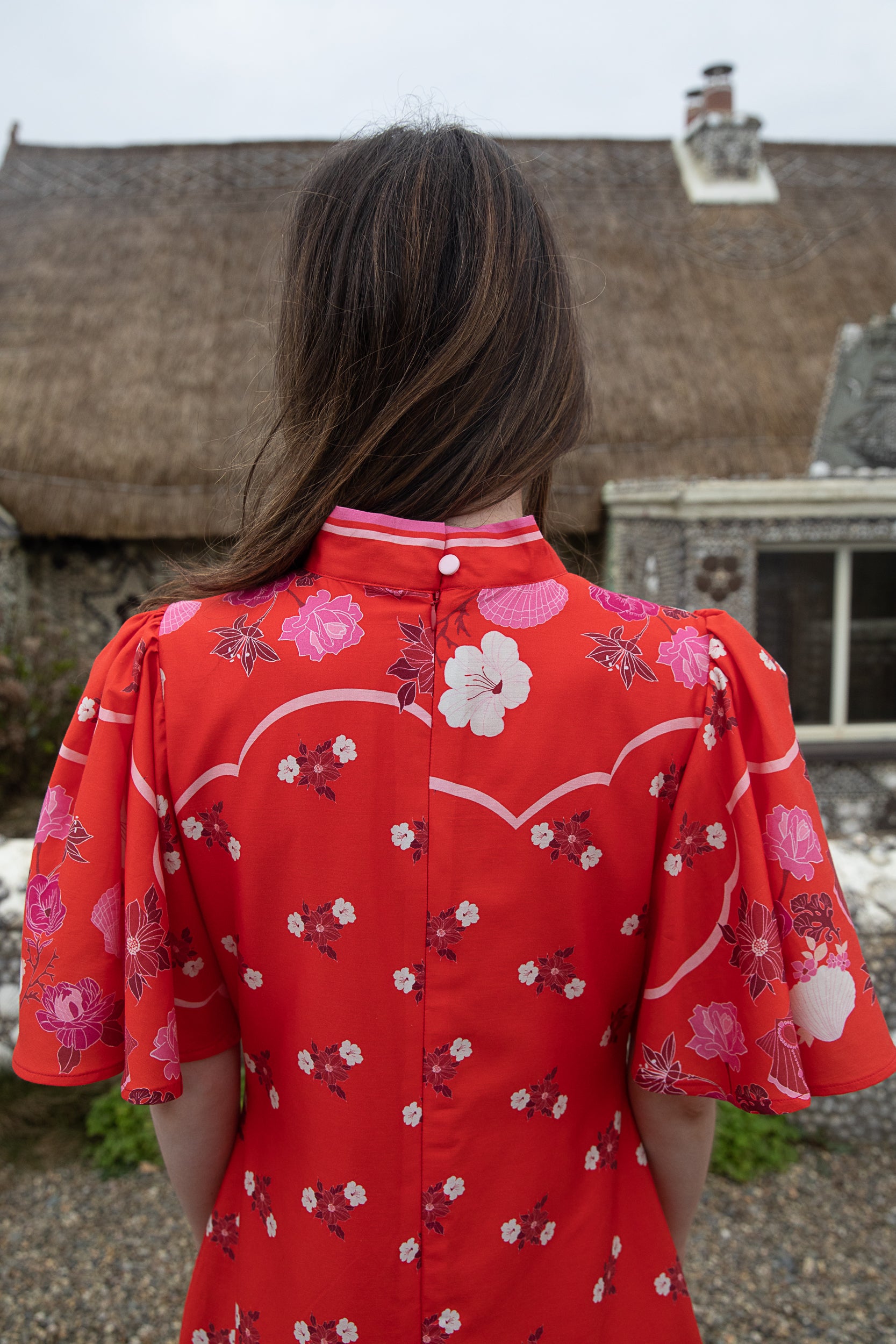 Stand out features include, flowing short sleeves, stand collar, straight skirt and gathered bodice.