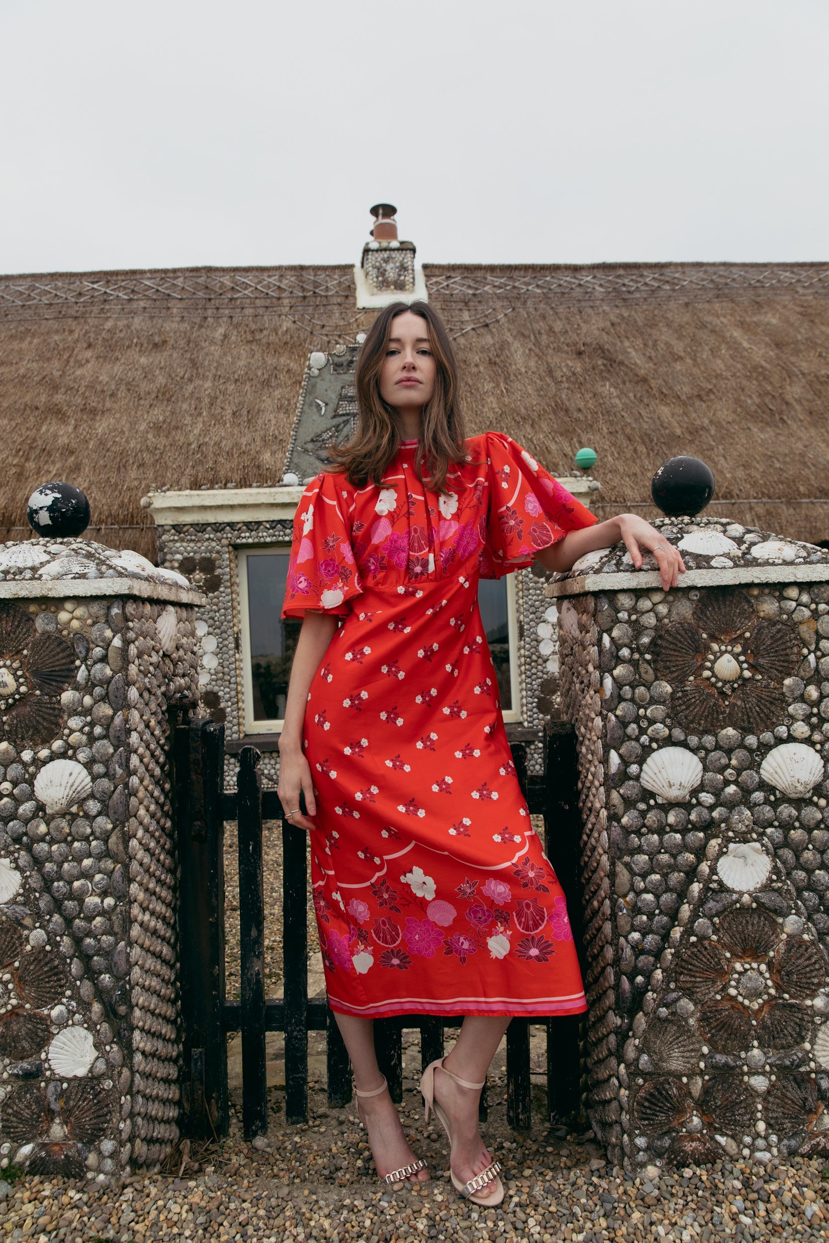 The Siren Song Midii dress features our own hand-drawn print, with a striking floral and shell motif on a red background.