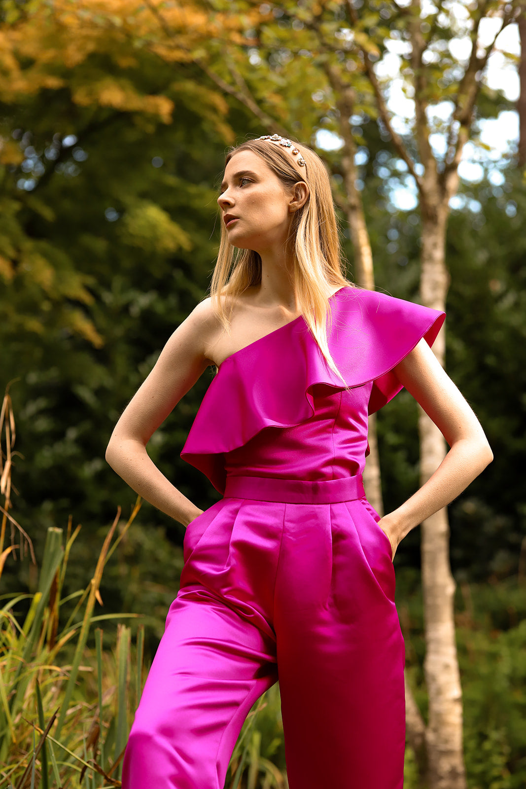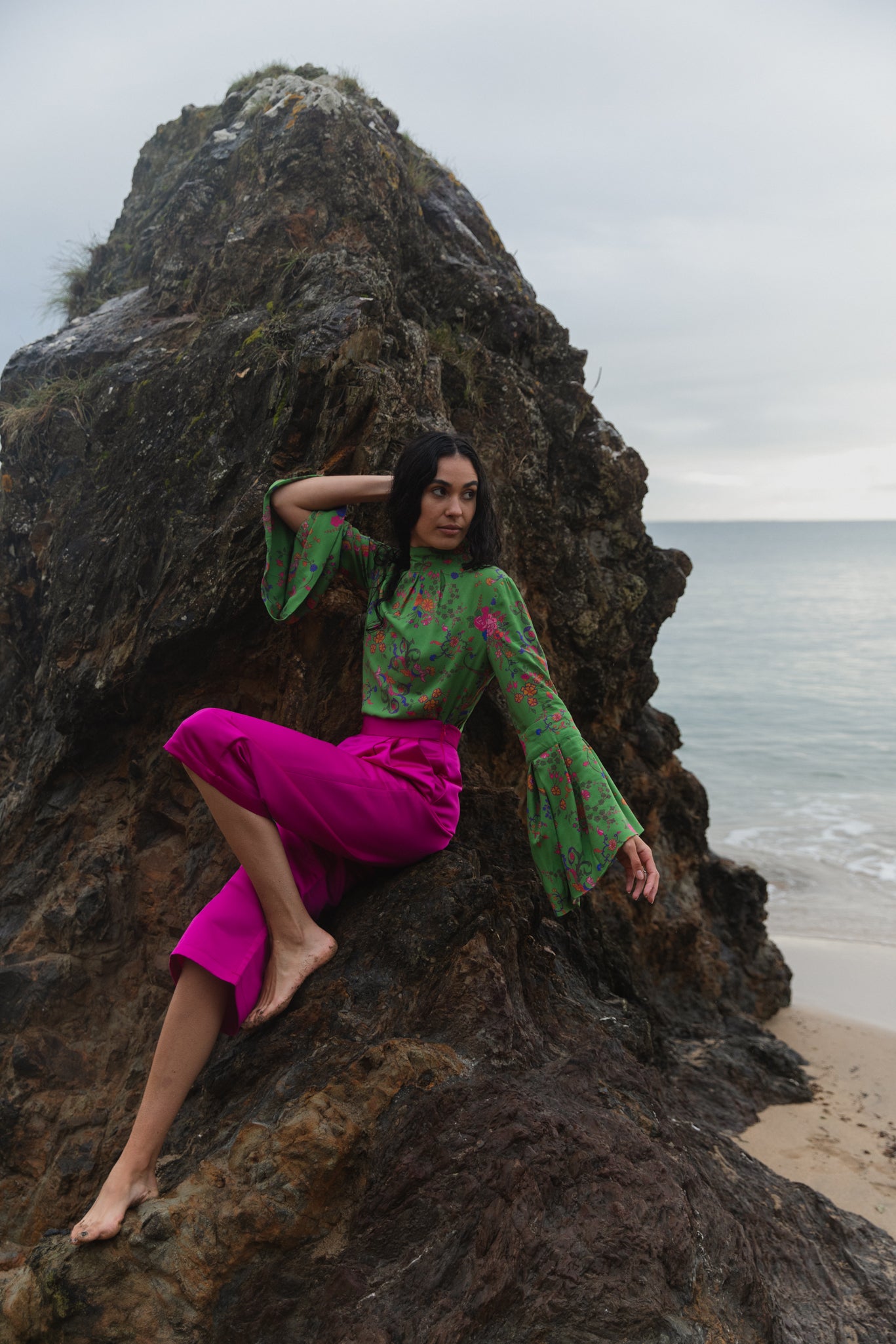 Our chic Sunrise Culottes in a radiant fuchsia pink satin are a statement piece. These dramatic wide leg culottes with side pockets are perfect for occasion wear or for that Friday feeling in the office.