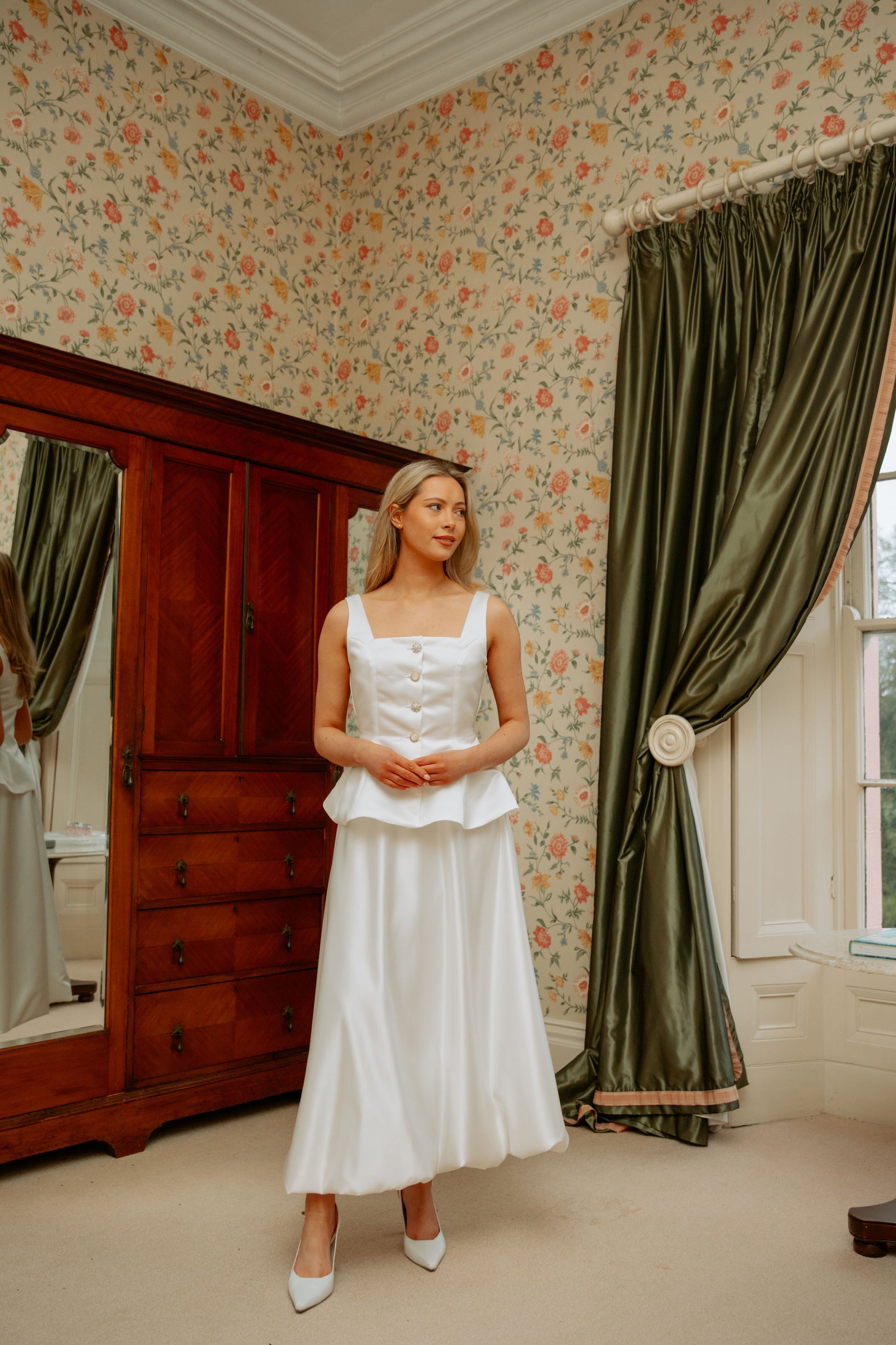 Make a statement in the Tulip Skirt. Featuring a bubble hem line and crafted from an ivory duchess satin.