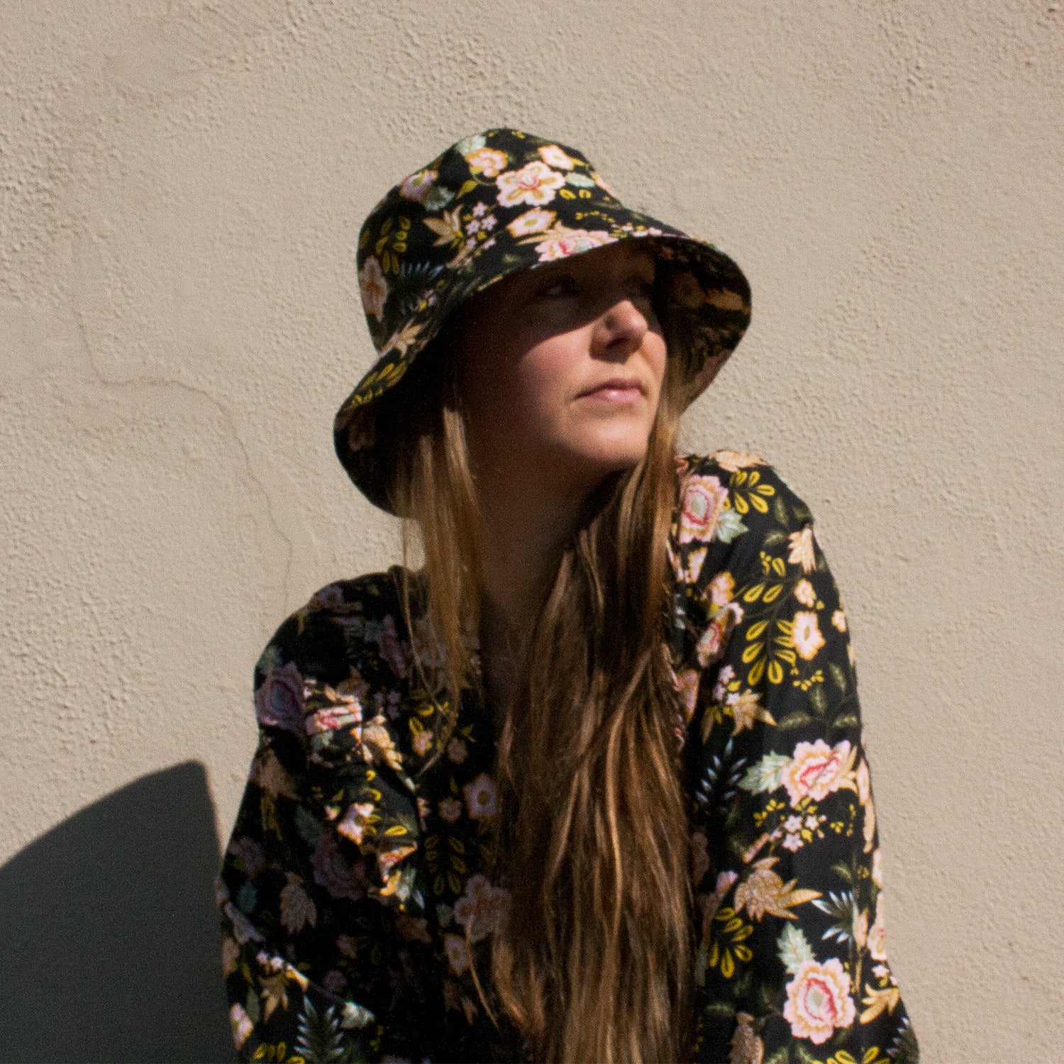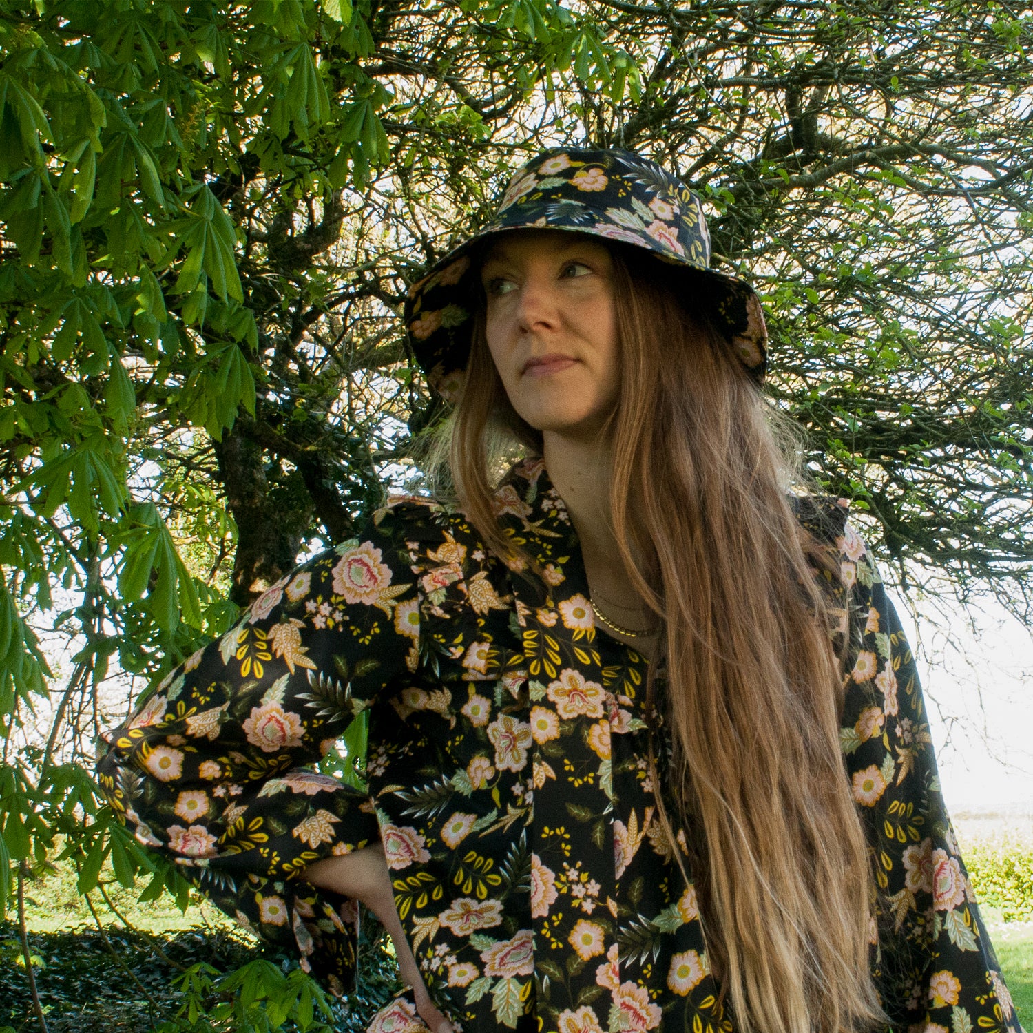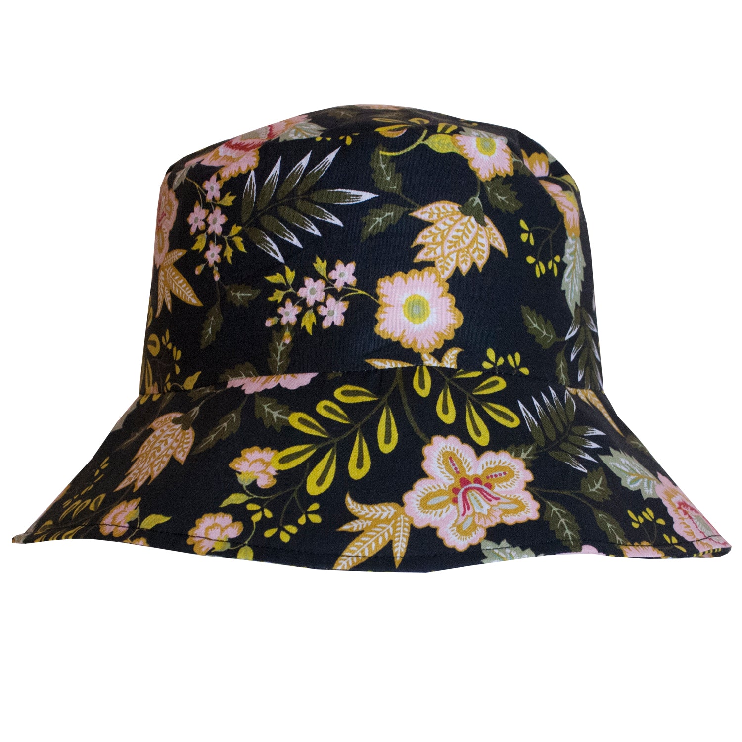 The Wallflower Bucket hat featuring a stunning floral print on a black background, is perfect for sunny days in the garden.